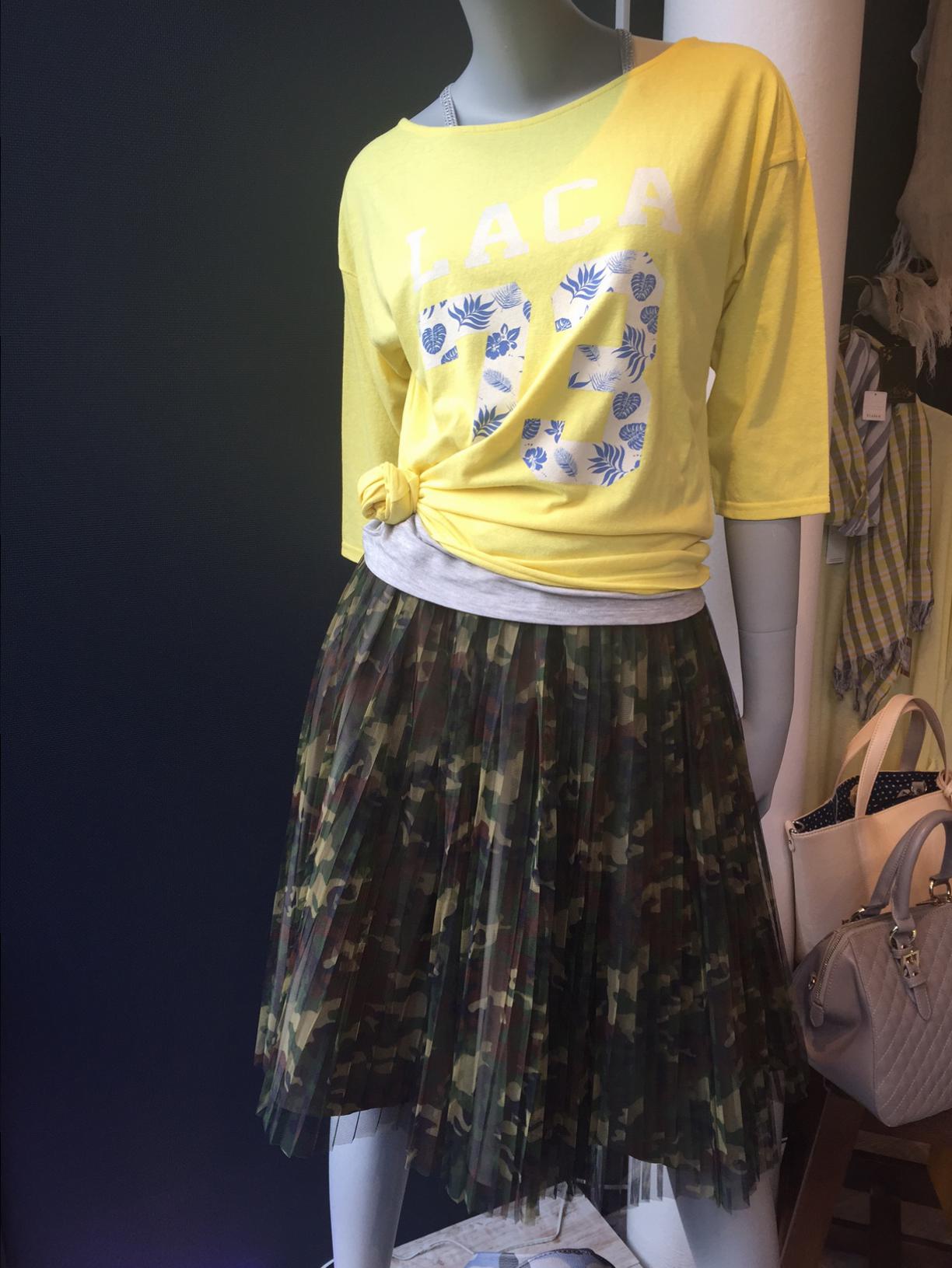 迷彩のプリーツスカート 迷彩とプリーツ! 最新のトレンドバッチリのアイテムが入荷して参りました。 ビビッドなイエローのTシャツでカジュアルダウン!でいかがですかねーっ? ルンルンな春真っ盛りですよぉ〜 スカート 13800円 Tシャツ 6900円 山崎範子 2015年3月23日