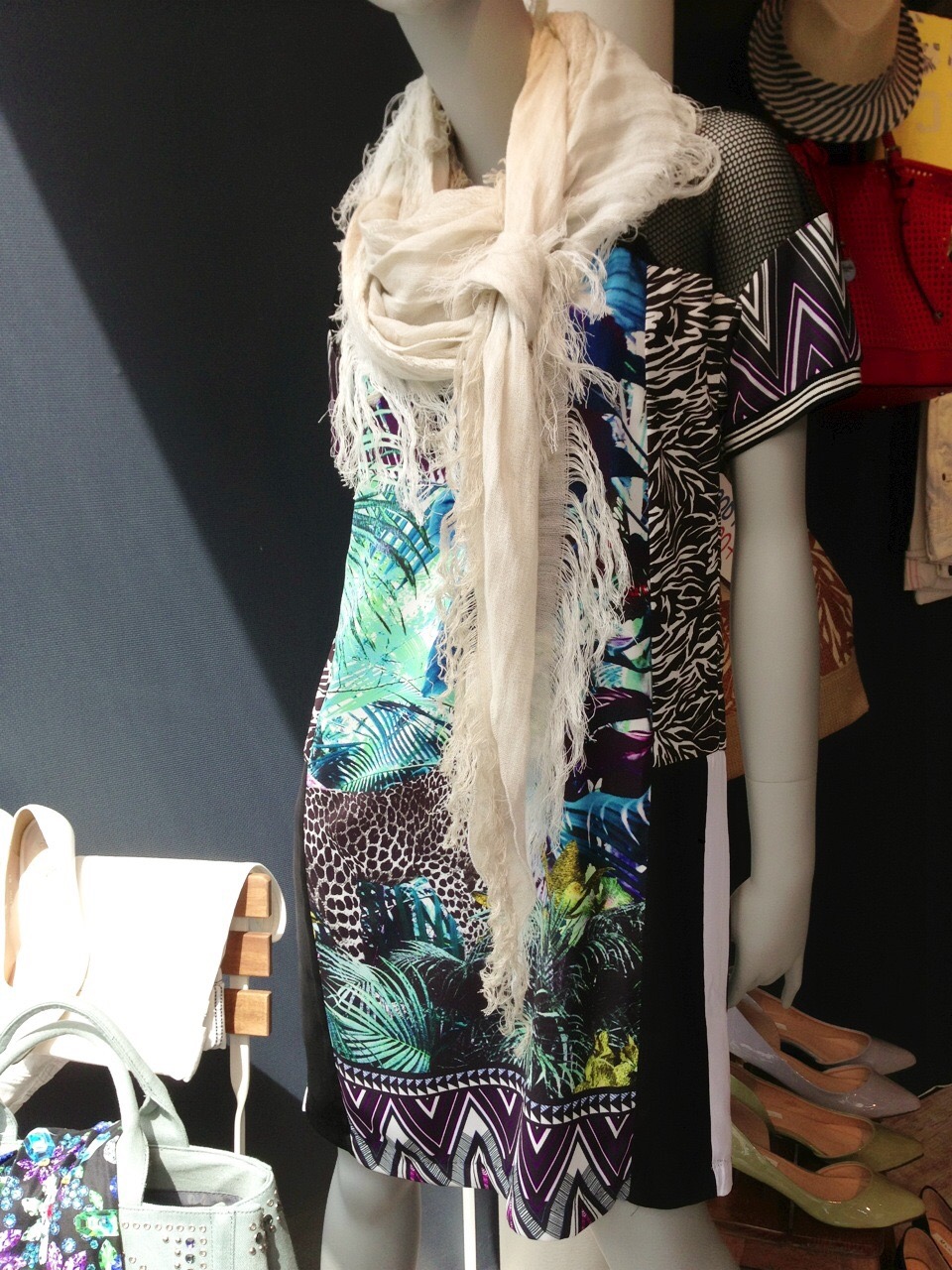 ボタニカルプリントのワンピース サファリテイストのプリントが素敵なワンピースは、肩がメッシュの切り替えになった今年らしいデザインです。 上質なリネンのストールをかけて、サラッと着こなしたい、、、 山崎範子 2015年4月23日