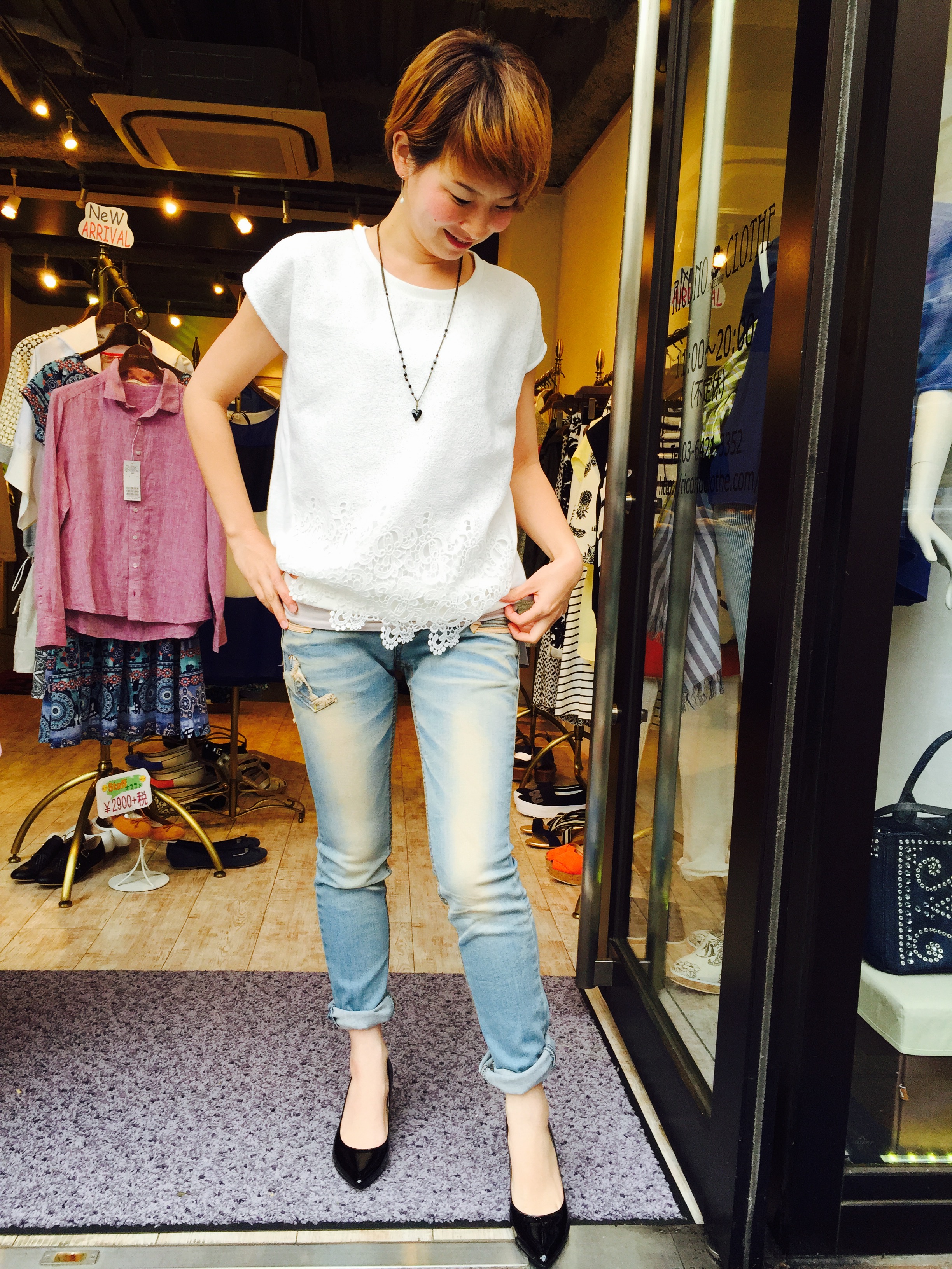 レースのプルオーバーとデニム 今季一押しのレースのトップスです! Tシャツなのに、クオリティの高いレースをあしらった秀逸な一品! パンツでもスカートでもOKの万能なトップスです 白と黒の2カラーで展開しております レースTシャツ 9800円 デニム 16800円 2015年4月25日