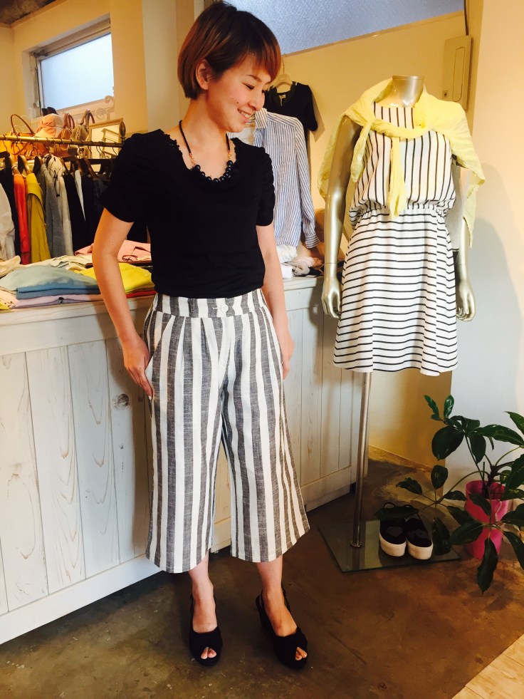 ストライプガウチョとデザインTシャツ 麻素材の爽やかなガウチョは、ストライプの生地でスッキリした印象になりましたぁーっ トレンドのガウチョはトップスと靴のバランスが着こなしの見え方を大きく左右します! 身長が低めの方はなるべくヒールのお靴を選んでくださいませねーっ Tシャツ 4900円 ネックレス 3900円 ガウチョパンツ 12800円 山崎範子 2015年5月27日