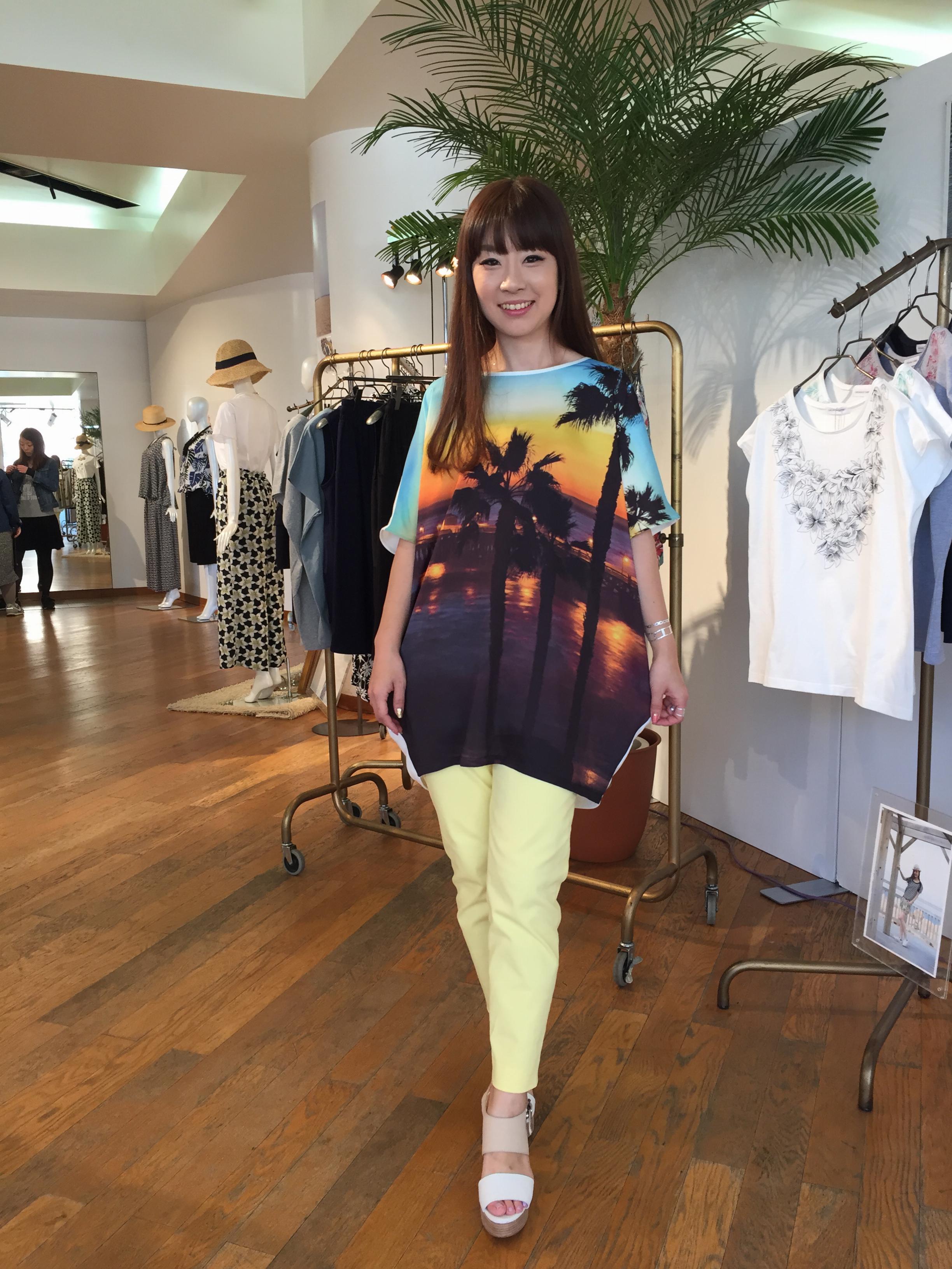 インクジェットプリントのTシャツ 新作のTシャツはインクジェットプリントのお洒落なデザインです。 スッポリとヒップまで隠れる楽チンなスタイリングがお好みな方にぜひーっ(⌒▽⌒) 山崎範子 2015年5月1日