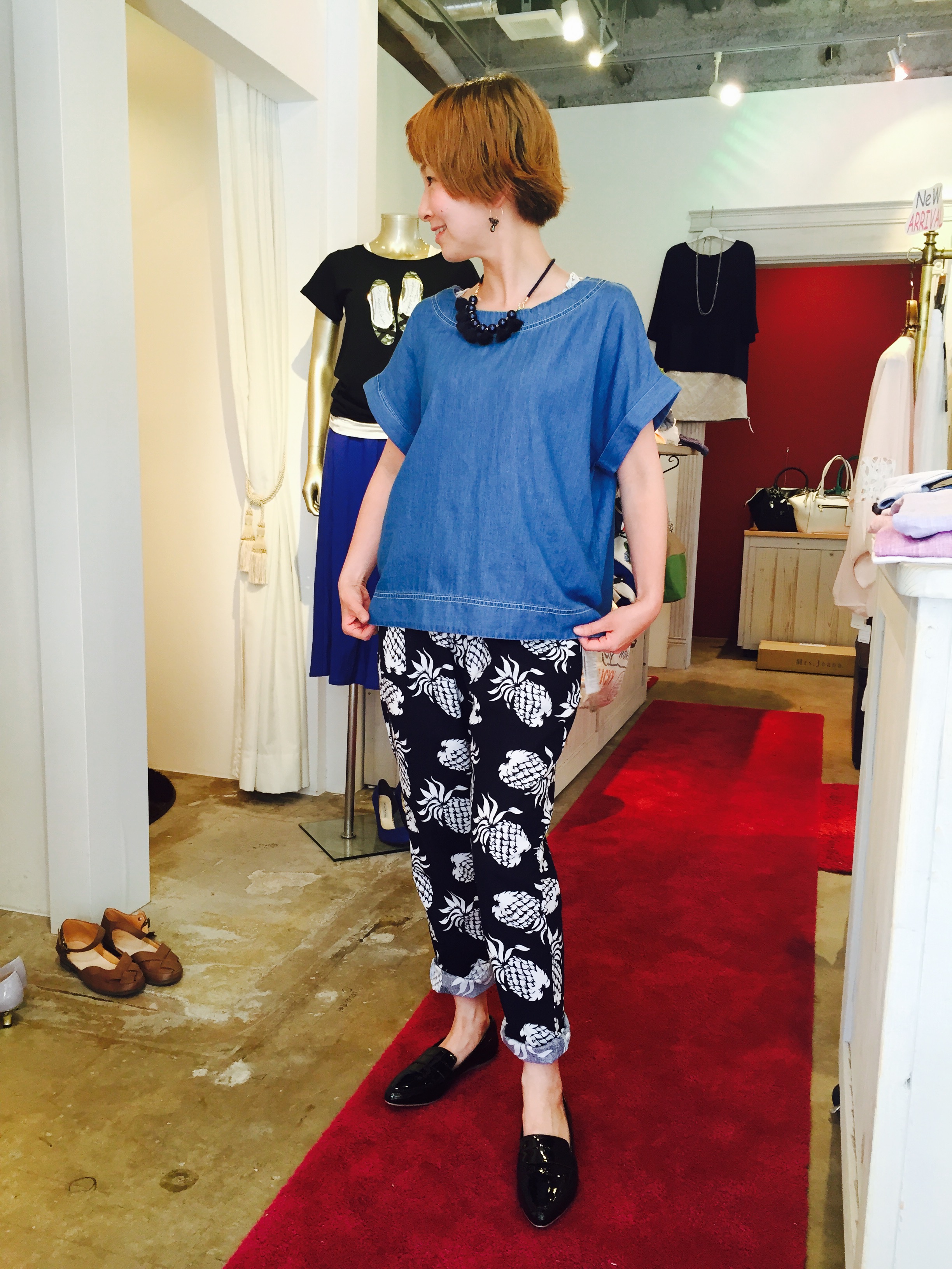 新作のパイナップルパンツとデニムのブラウスのコーディネートです