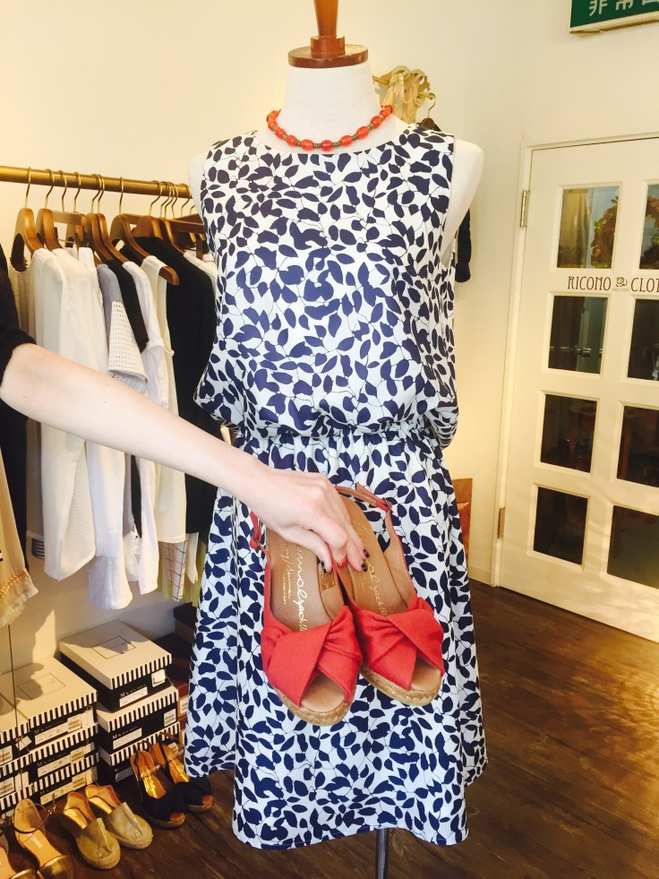 リーフプリントのワンピース 爽やかなリーフプリントのワンピースが入荷して参りました。 着丈は嬉しい膝丈ですよぉ〜〜 ポリエステル素材なのでシワにならずお洗濯も楽チン♡ 忙しい貴女にピッタリです ワンピース 19000円 ネイビーもございます 山崎範子 2015年6月5日