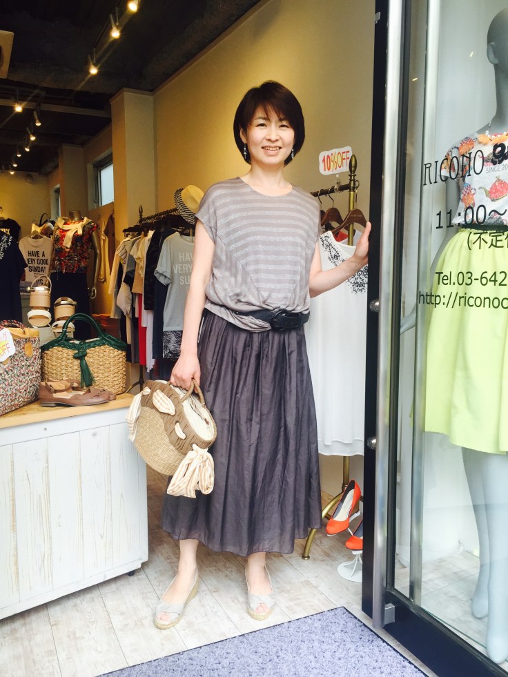 シルクコットンのロングスカート シルクコットンの上質な素材感が堪らないマキシ丈のロングスカートが入荷しております。 ボーダーのデザイントップスでカジュアルにスタイリングしてみました。 同色系の上下を合わせる時は、引き締めのポイントをお忘れ無くです♡ ボーダーデザイントップス 5900円 シルクコットンスカート 14800円 本革サンダル 14800円 カゴ 11000円 山崎範子 2015年6月10日