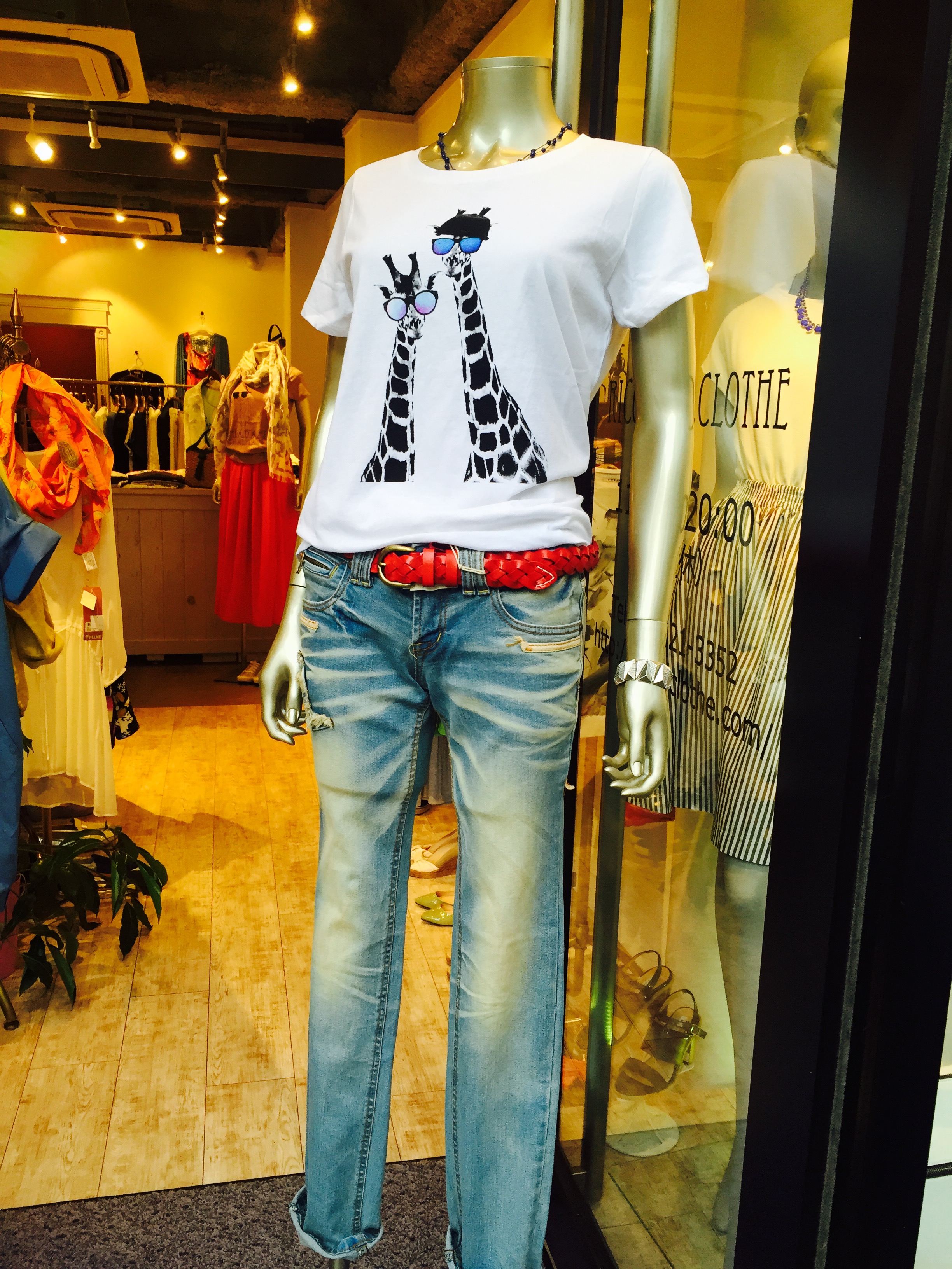 アニマルプリントのTシャツとインポートデニム 大人気のサングラスキリン♡のTシャツが、追加生産で再入荷致しましたぁー 今週末は、特別価格にて販売いたしますよぉ〜 限定枚数なので、欲しい方はお早めにお問い合わせくださいませねぇ キリンTシャツ SALE 4900円♡ 本革ベルト 4900円 山崎範子 2015年6月18日