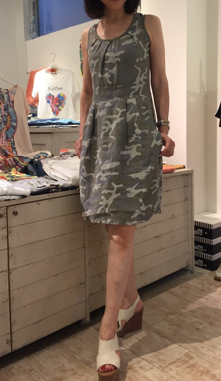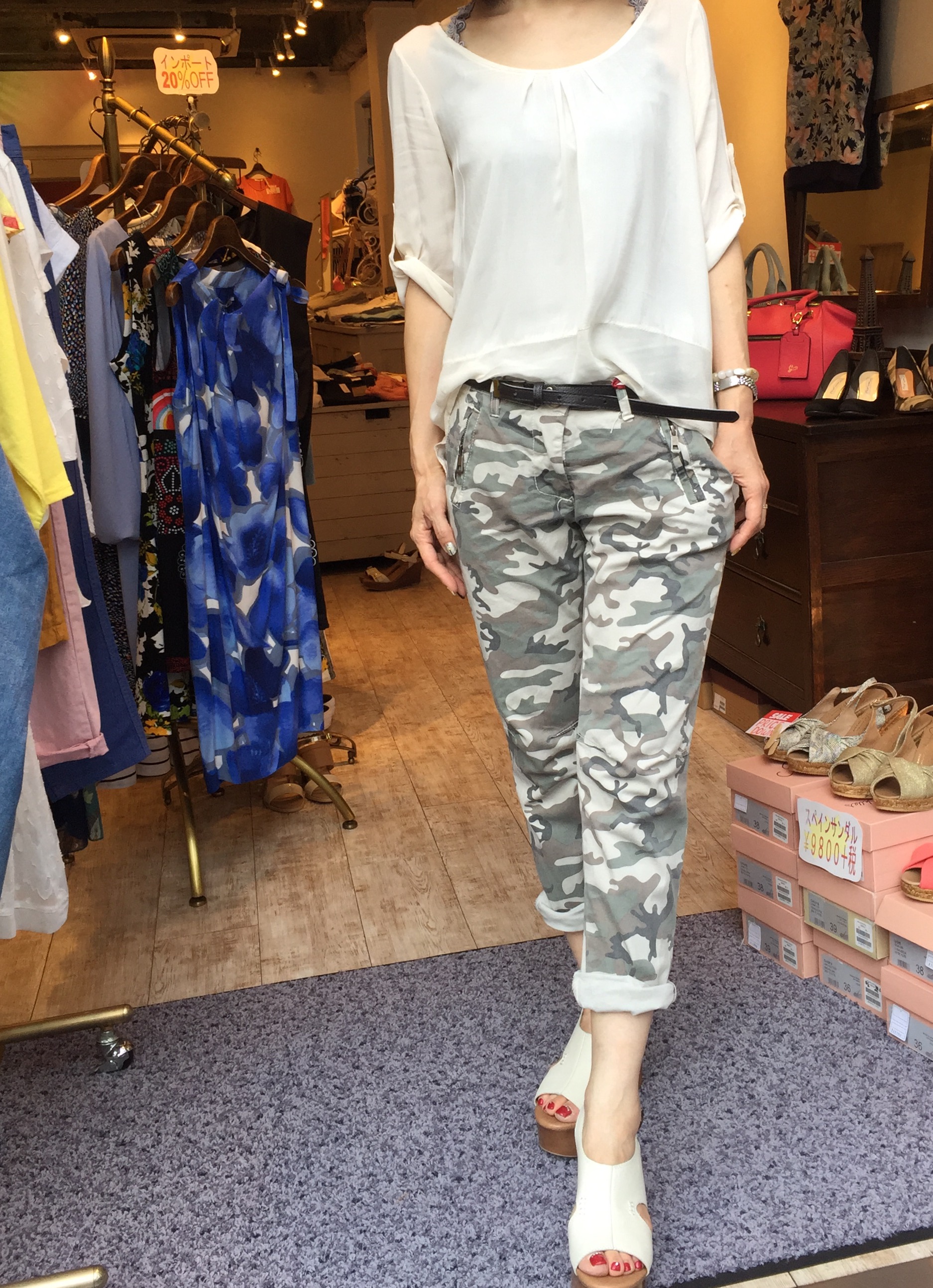 迷彩のコットンパンツ イタリアインポートの迷彩パンツは、ボーイフレンドタイプのデザインで猛暑にもサラサラの着用感! とにかく毎日あんまり暑いから、サラサラで着心地の良いアイテムを探して参りました! 涼しいアイテムをお探しの貴女に、、、 ブラウス 8900円 パンツ 10500円 山崎範子 2015年7月30日