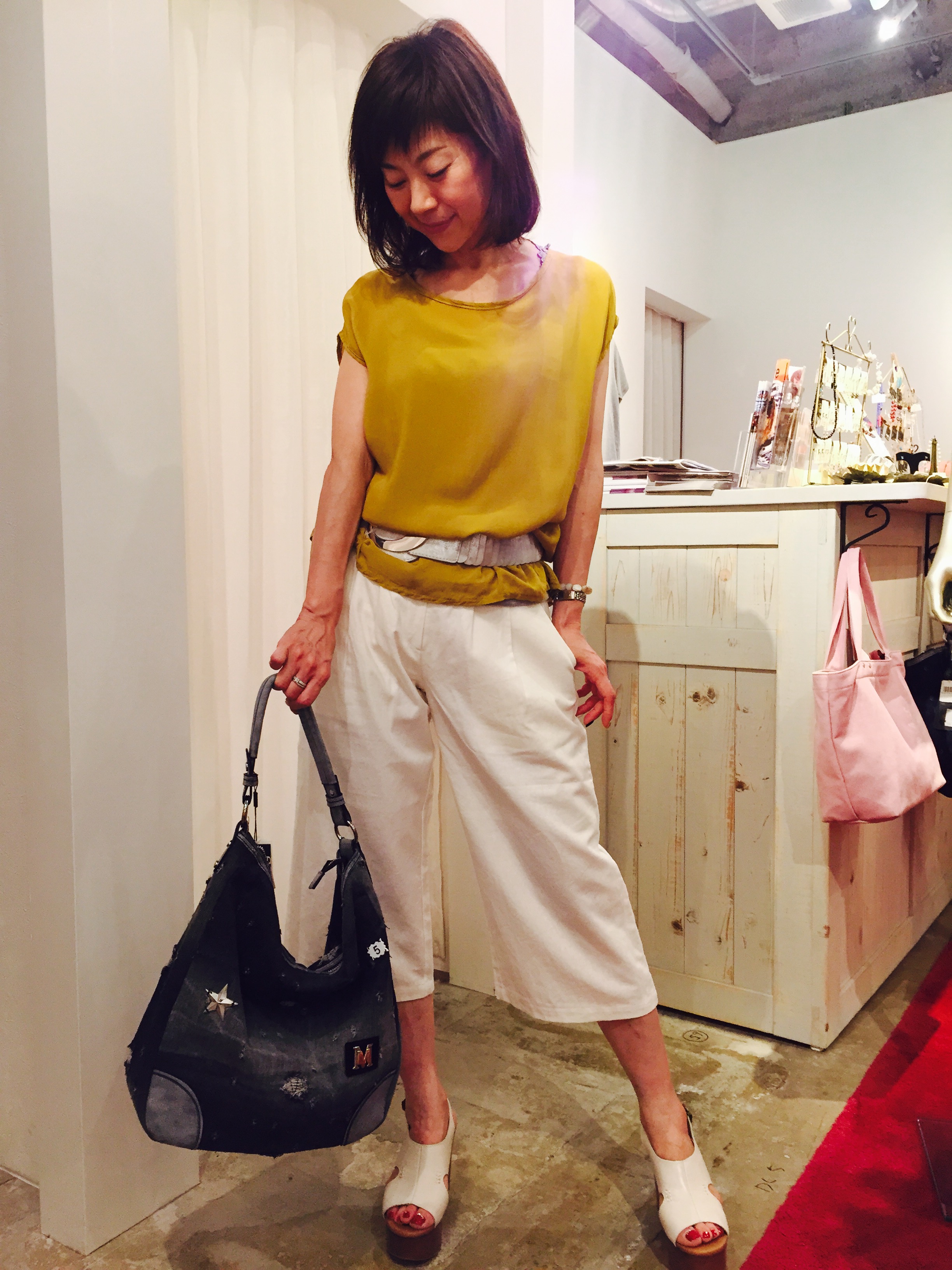 白のガウチョパンツ 8900円 爽やかな白いガウチョパンツが再入荷してきましたぁーっ 秋のカラーも意識したマスタードカラーのブラウスでコーディネート 足を長ーくすると、難しそうなガウチョパンツも難なくクリアー 本革の白い厚底サンダル 9800円もお薦めですよぉ〜 ブラウス 5500円 ベルト 6900円 ガウチョパンツ 8900円 本革のサンダル 9800円 山崎範子 2015年7月29日
