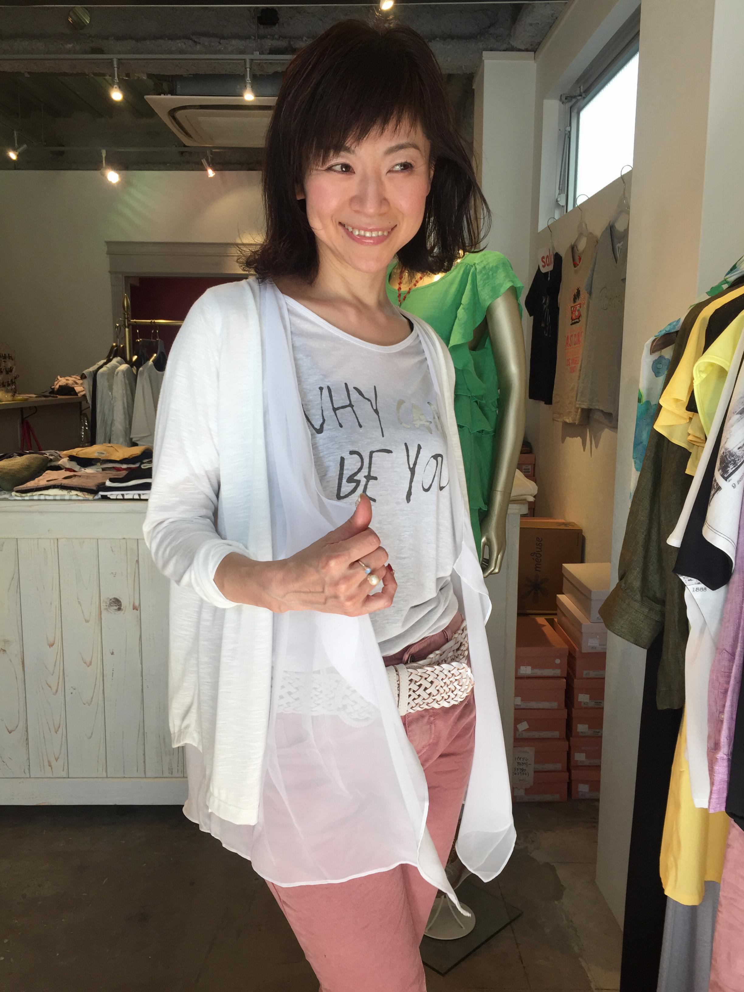 シフォン切り替えのデザインカーディガン カットソーとシフォンの切り替えが素敵な真夏も使えるカーディガン 大人な雰囲気の英字テイシャツと合わせて爽やかな夏スタイル! テイシャツのお袖が少し長めなのが嬉しいですよぉ〜 テイシャツ 3990円 カーディガン 6826円 山崎範子 2015年7月10日