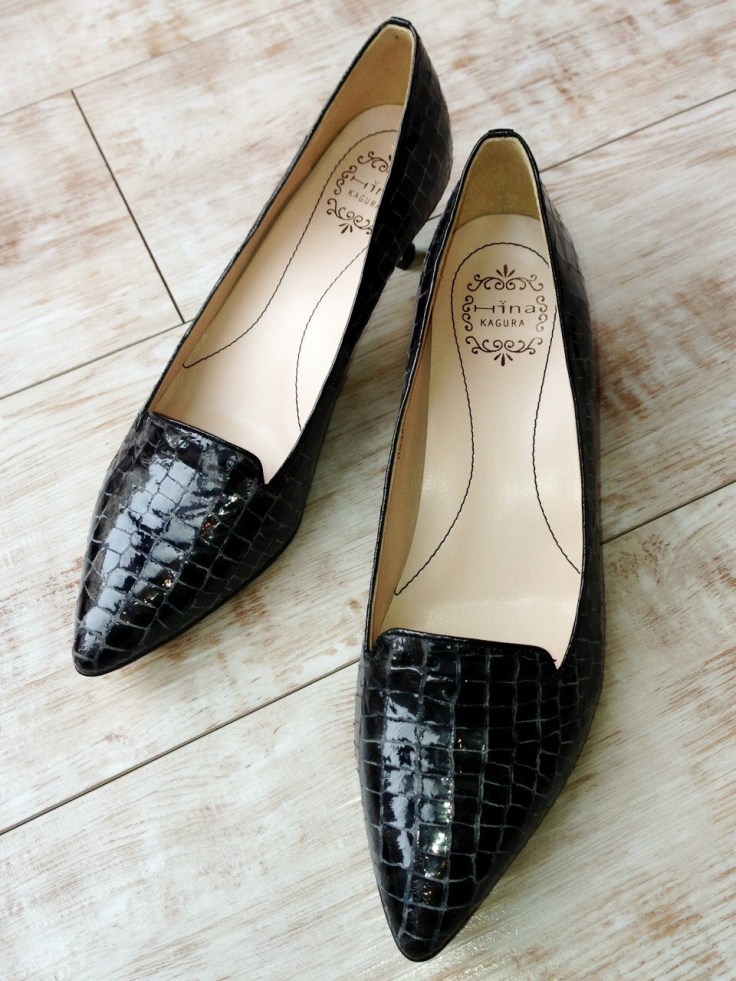 型押しクロコのパンプス 22cm〜22.5cm 日本製のクロコのパンプスです 驚きのフィット感で大好評を頂きまして、ラスト一足は、22.5cmとなりましたっ おサイズが合いましたら、ラッキーですよぉ〜 とーにかく、履きやすいです ブラックのエナメルは、24センチもございます 山崎範 2015年8月28日