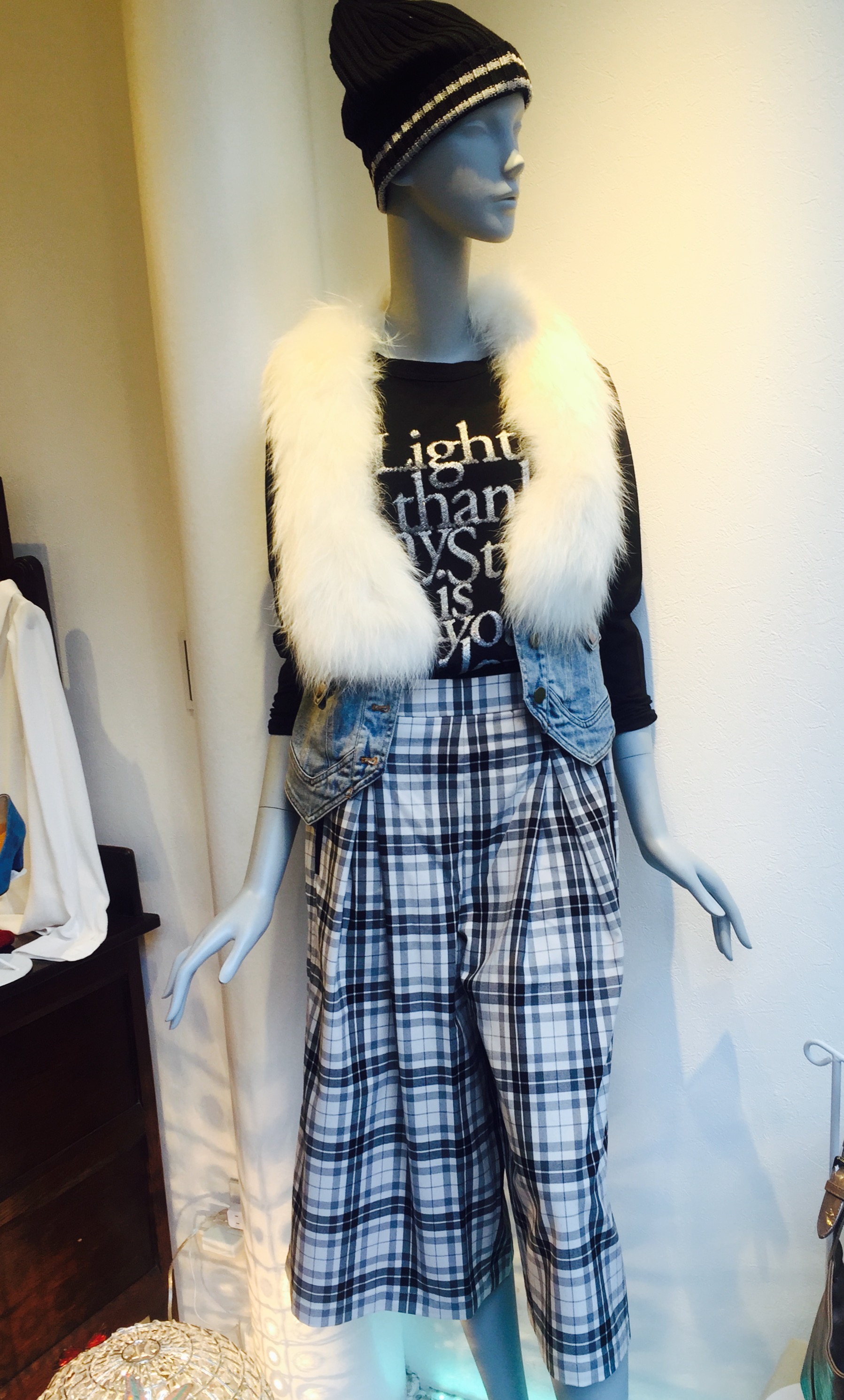 チェックのガウチョパンツ 素敵なチェックのガウチョパンツが入荷して参りましたぁーっ シックなマドラスチェックで、オシャレ度抜群‼︎ 英字のカットソーとデニムのファーベストでコーディネートしてみました。 チェックガウチョパンツ 12000円 英字のカットソー 5900円 山崎範子 2015年8月29日