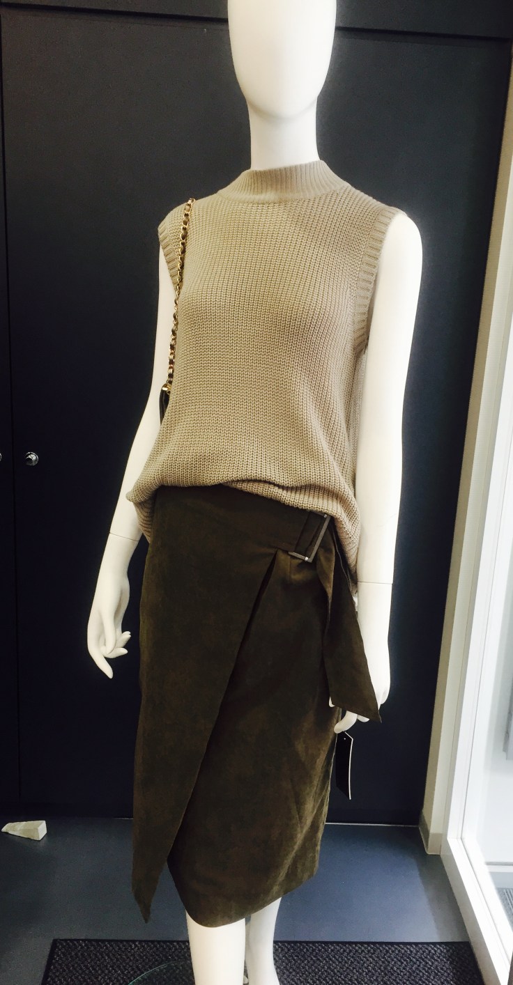 デザインニットとフェイクスゥエードの巻きスカート 今期の注目素材、フェイクスゥエードの巻きスカートが入荷して参りました! 良い女風ーっ、才女のイメージ! なんちって(⌒▽⌒) とにかく、新鮮でカッコ良いですよぉ〜 お色はキャメルとカーキの2カラーです フェイクスゥエード巻きスカート 10800円 山崎範子 2015年8月29日