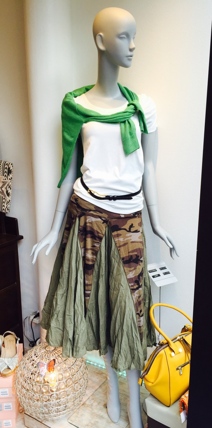 迷彩のスカート 6900円 迷彩プリントのデザインスカートが大人気です! 形は、裾にボリュームのあるミモレ丈! 素足にサンダルでシックに着こなせますよぉ〜 明日、再入荷です。 欲しい方はお早めにーっ デザインスカート 6900円 Tシャツ 3920円 カーディガン 4900円 山崎範子 2015年8月9日