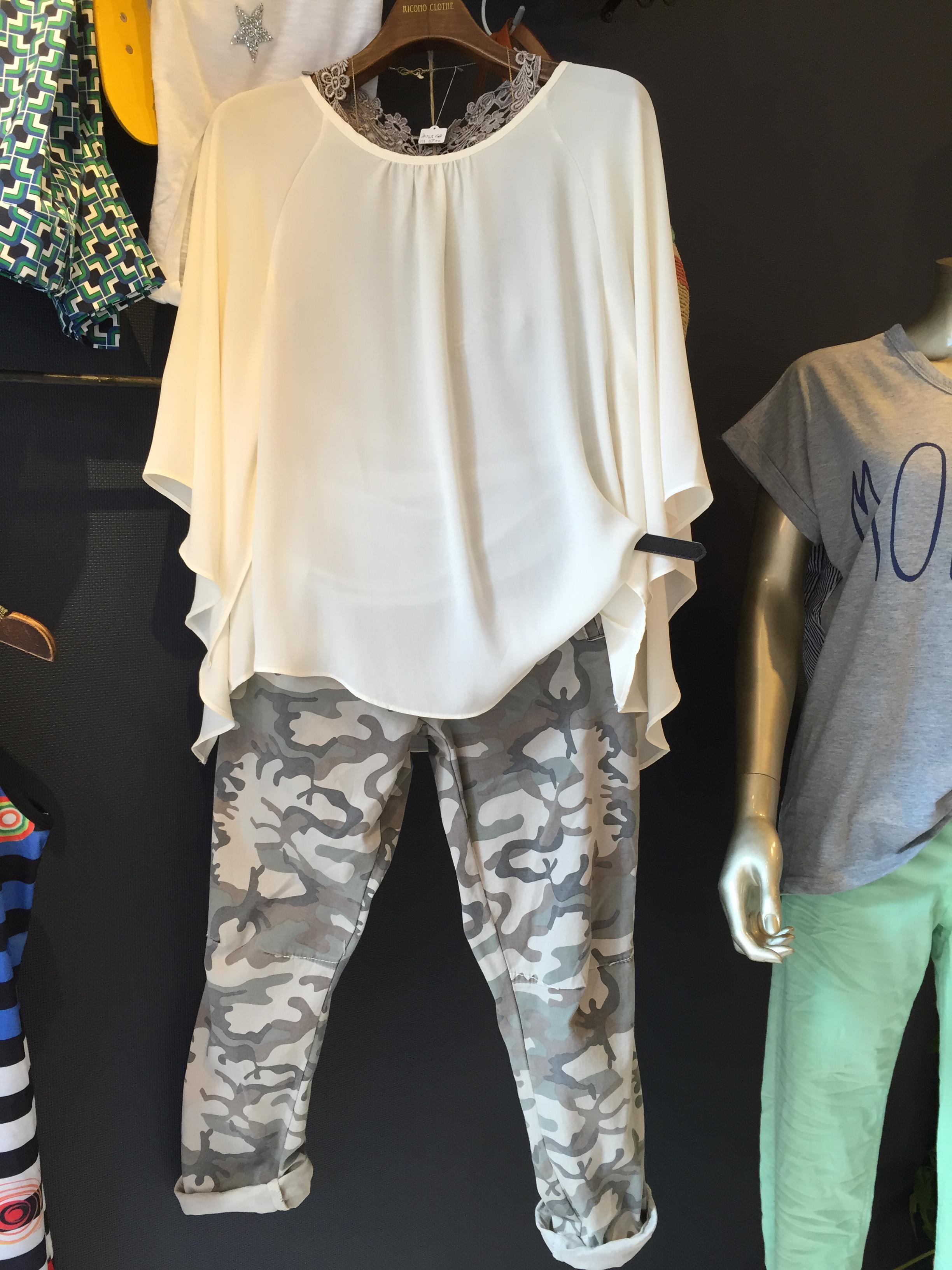 シフォンのブラウスと迷彩パンツ サラサラ爽やかなシフォンのブラウスと、クールな迷彩パンツのコーディネートです パンツは、少しゆったりした綿パンになります。 夏のお出かけにいかがでしょうか? めっちゃクールで爽やかですよぉ〜 パンツは、MサイズとLサイズになります 山崎範子 2015年8月9日