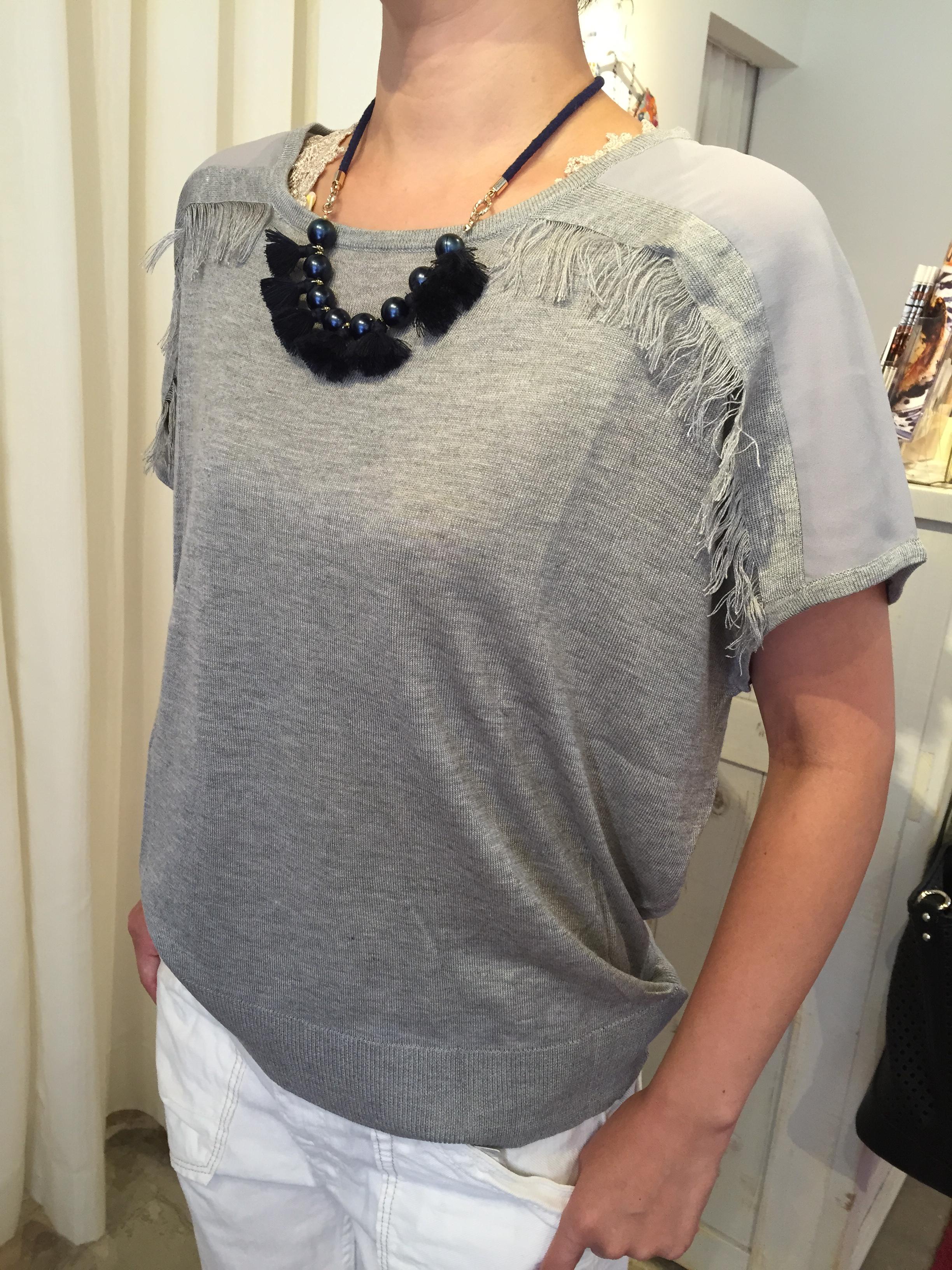 フリンジのトップス 6900円 秋冬のトレンド、フォークロアを意識したトップスはフリンジ付きの軽ーいサマーニットです。 見頃はニットで、肩がシフォンです。 レーヨン素材のニットなので、35度以上の猛暑日も、サラサラっと、着られて、とってもおしゃれなのでーす グレー、ネイビー、ブラック、ベージュの4カラーです フリンジトップス 6900円 山崎範子 2015年8月9日