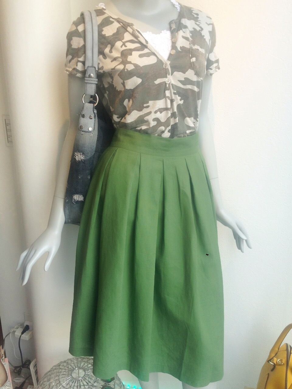 迷彩のTシャツとスカートのコーディネート インポートの迷彩Tシャツは、少しこなれた感じがカッコ良い! おしゃれなグリーンのスカートでフェミニンに着こなしてみてはいかがでしょうか? Tシャツ 4900円 スカート 8900円 山崎範子 2015年8月10日