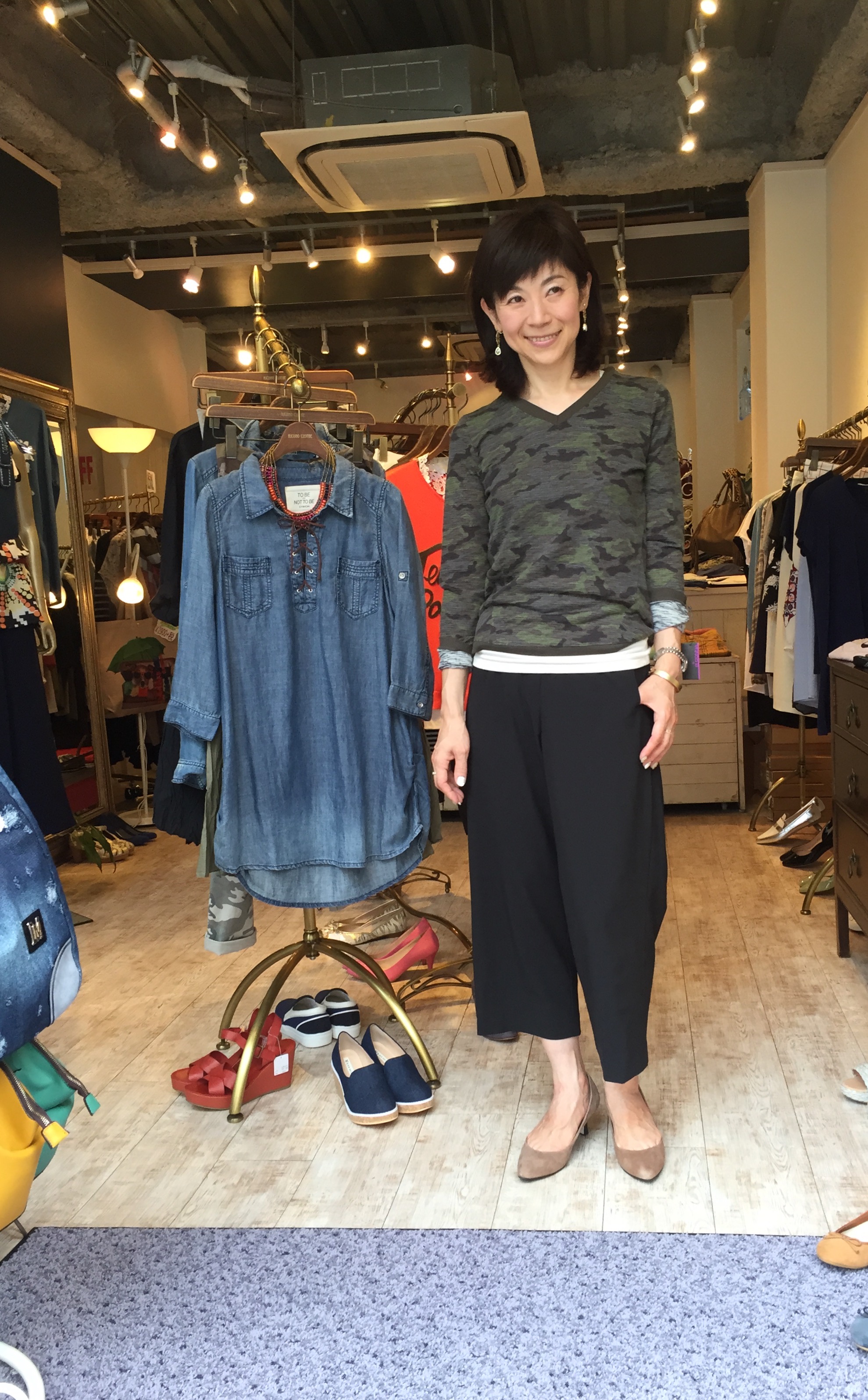 迷彩のトップスとクロプトパンツ 秋の迷彩はシックな雰囲気 こちらは春先までずっと着られそうな、着心地抜群のプルオーバーです 暗いカラーのトップスとボトムスをコーディネートするときは、ウェストの差し色をお忘れなくーっ ぐっと垢抜けますよん 山崎範子 2015年8月21日
