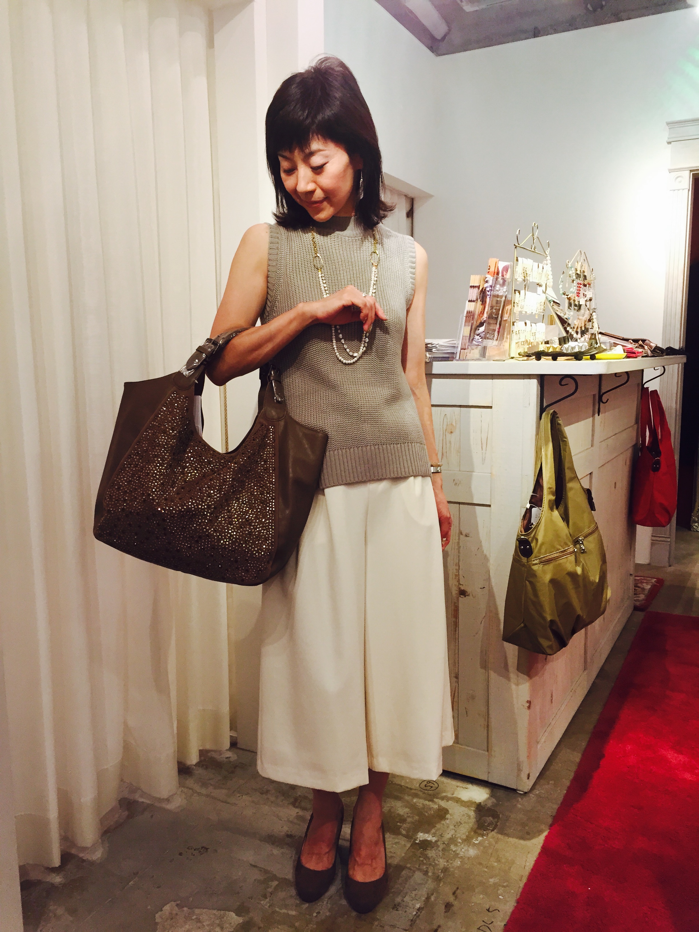 白いガウチョとノースリーブニット この秋は白いガウチョが新鮮です♡ グレーや、ベージュ、カーキとの組み合わせもおしゃれ〜っ とっても着心地の良いオフタートルのニットも再入荷しましたぁ ネイビー、ブラック、ベージュ、グレーの4カラーです ガウチョパンツ 13000円 ニット 7900円 パンプス 8900円 2015年9月6日