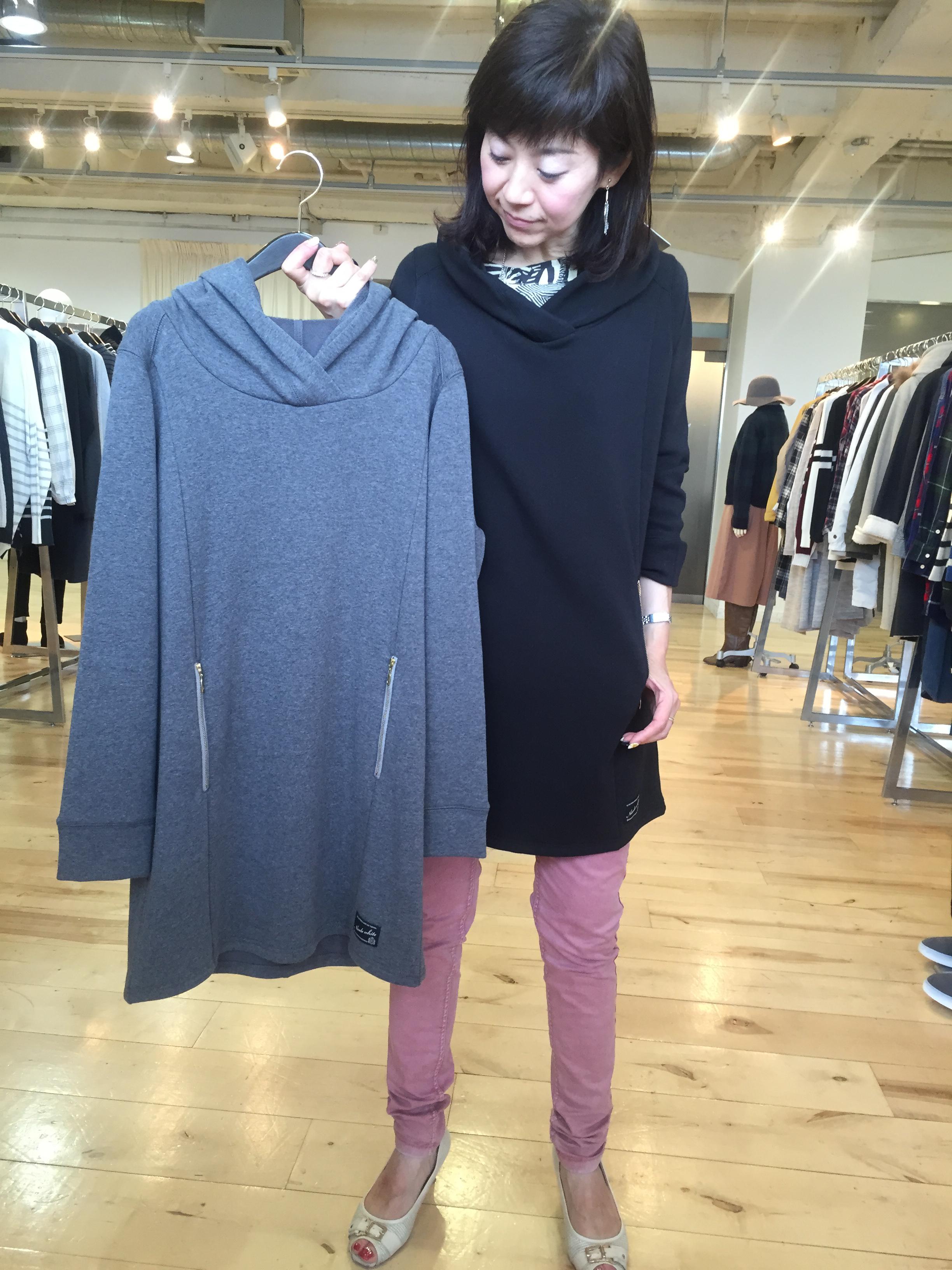フード付きチュニックワンピース 5900円 カジュアルで着やすい、スウェット素材のワンピが入荷しております。 今から春まで大活躍ですよぉ〜 いつもすぐに売れてしまうので、気になる方はお早めにでーす 山崎範子 2015年10月5日