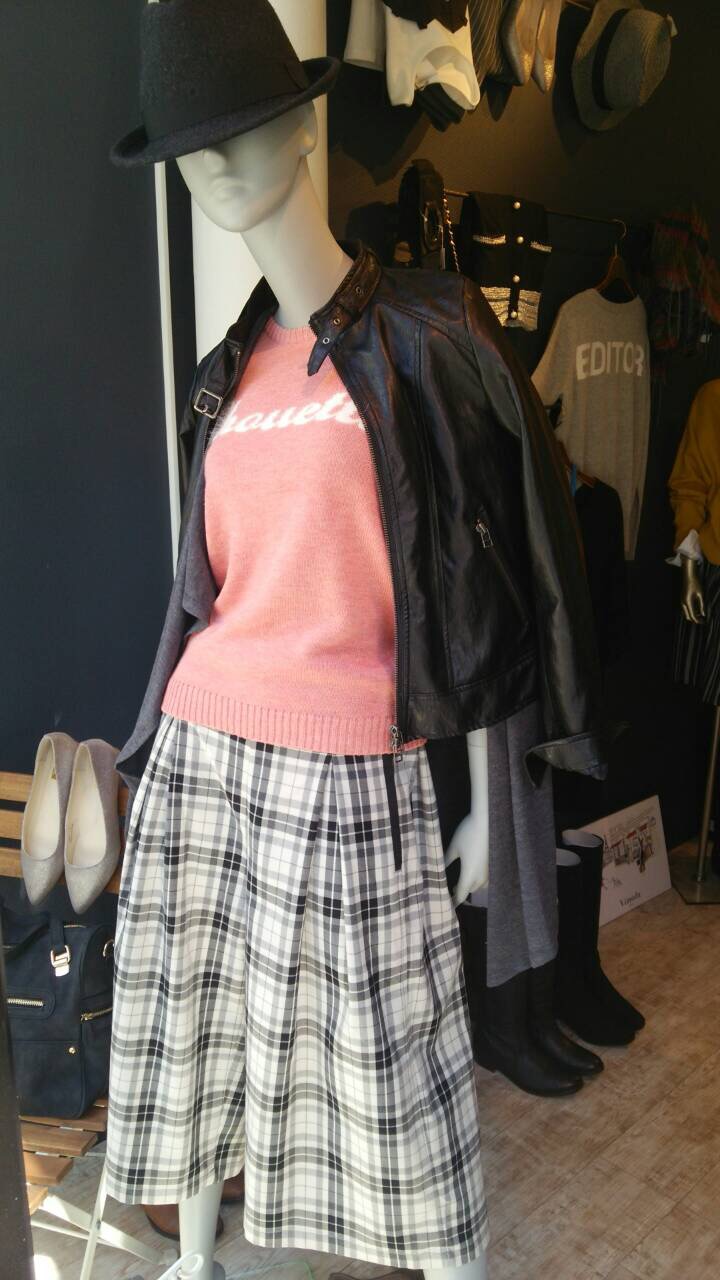 ピンクと黒の組み合わせ 大好評の黒と白のチェック柄ガウチョパンツに あえて明るいピンク色のニットを合わせるのも可愛い組み合わせです。 ちょっとハードなデザインのライダースジャケットも 中にピンクが見えることでキュートに見えますね♪ パンツ ¥12960 ニット ¥10584 ジャケット ¥21384 2015年10月8日