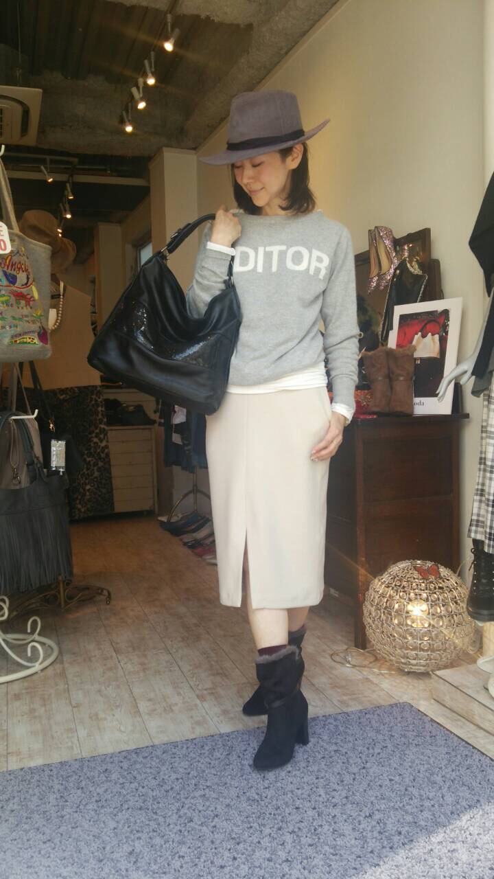 ニコルのデザインニット EDITOR の文字がスタイリッシュな、2WAYニットです プルオーバーとして、また、ニットカーディガンとしてお使い頂けます。 今期のトレンドのミモレ丈のタイトスカートと合わせて、旬の着こなしを楽しんでみてくださいね 帽子 5900円 ブーツ 12800円 スカート 7900円 山崎範子 2015年10月9日