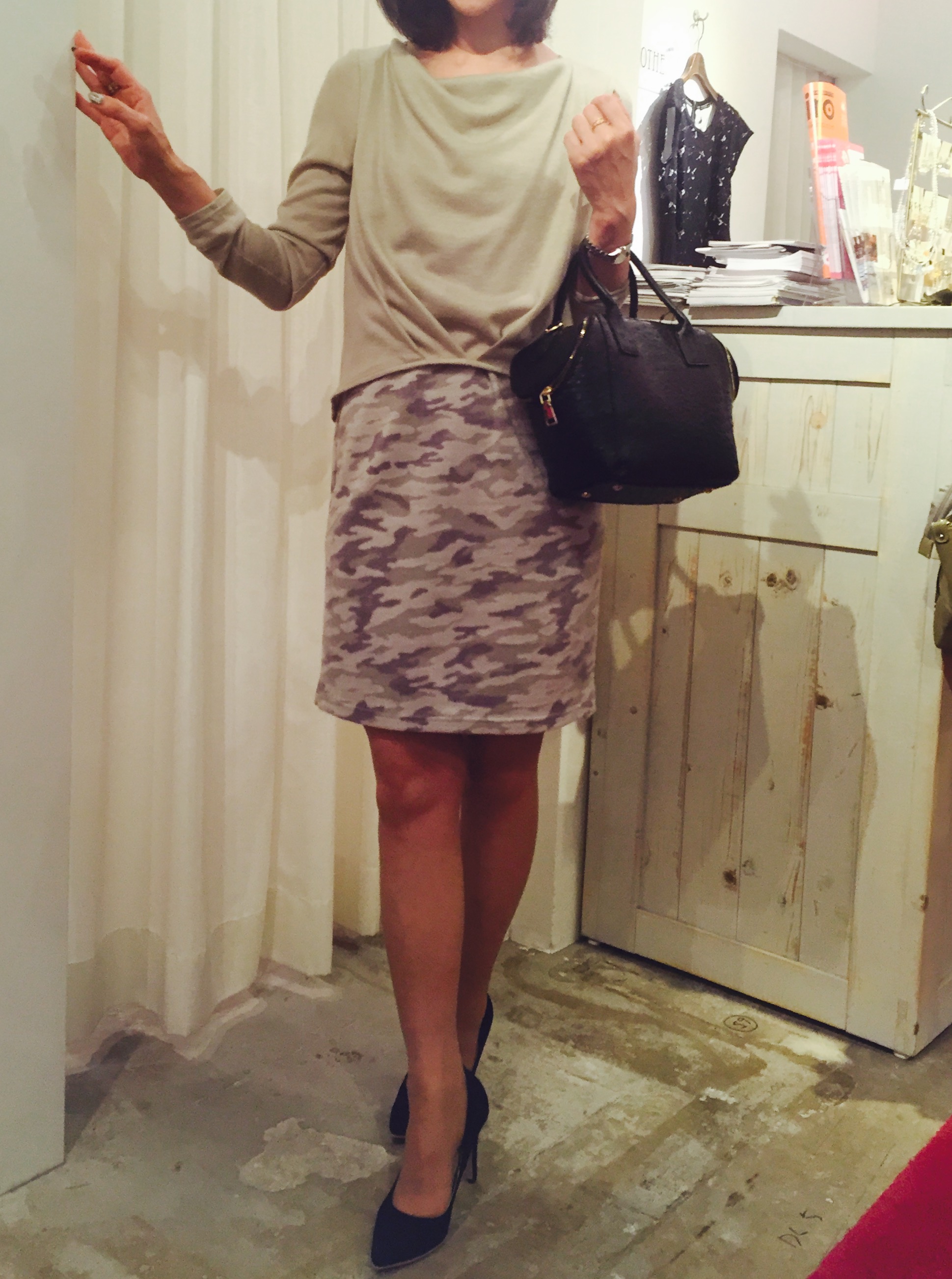 迷彩のワンピース ベージュ 一枚でスッキリ着られるワンピース。 忙しい朝にコーディネートを考えなくて良いからーっ、めっちゃ便利ですよねぇ お袖のあるワンピースはなかなか無いですよん。 春まで大活躍間違い無しっ 山崎範子 2015年10月15日
