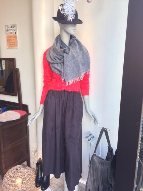 すっきりワイドパンツ フェイクスウェードのワイドパンツはトップスに短めの丈を持ってくることですっきり見えます。 この万能あったかふわふわカーディガンは丈もちょうどよく、ボリューム的にもぴったり♪ ワイドパンツなので寒い日は下にタイツを履いちゃってもOKですね☆ ニット ¥7560 パンツ ¥10584 2015年11月30日
