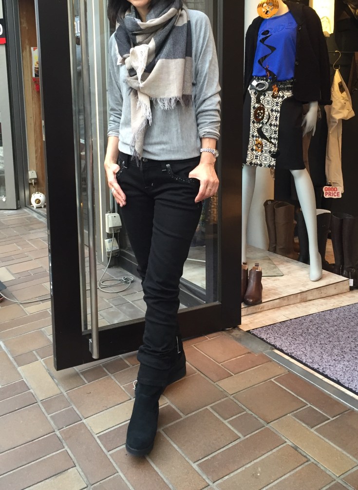 ブロックチェックのストールと黒パン イタリアから入荷の上質なストールが大人気です。 シンプルな着こなしをおしゃれに見せる必需品。 足元は黒パンにフカフカのムートン黒ブーツで、すっきり足長スタイルです ニット 7900円+税 ブーツ 16800円+税 山崎範子 コメントは受け付けていません。