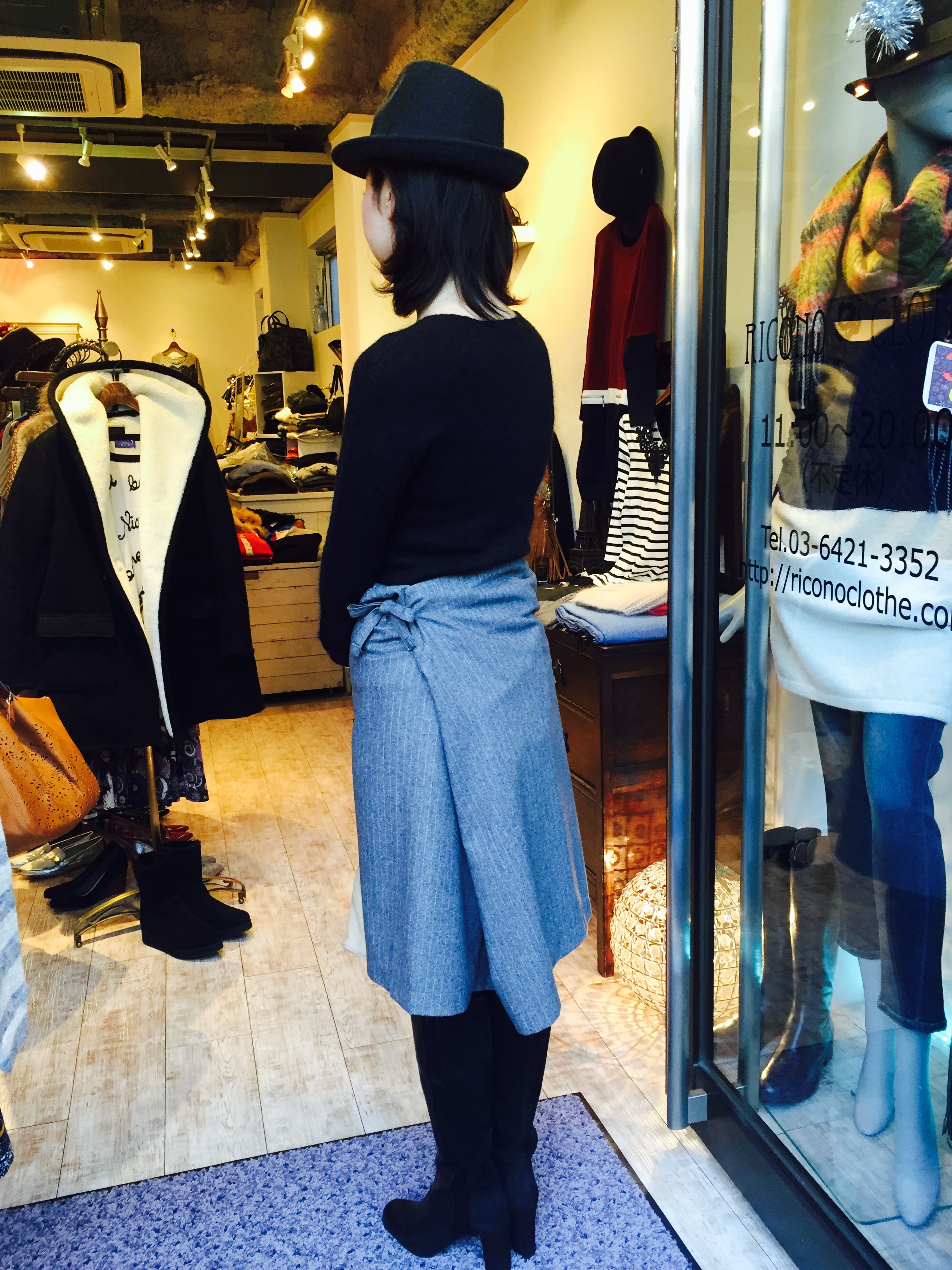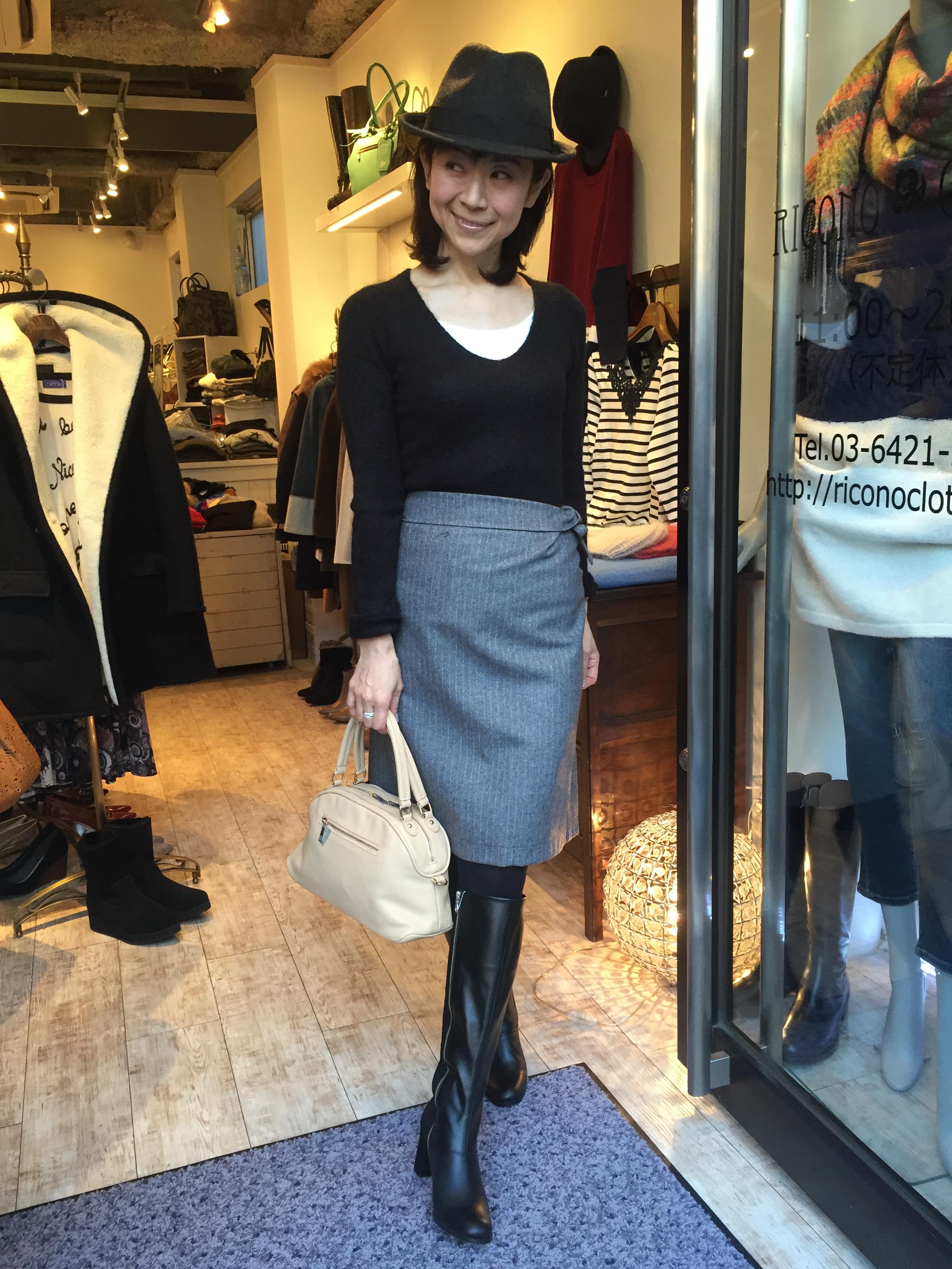 ストライプのデザインスカート めっちゃおしゃれなストライプのデザインスカートが再入荷いたしましたぁーっ 巻きスカートのタイプですが、ぐるっと輪になっているので、はだけてしまう心配がございません。 とても上質なウール素材で着心地抜群ですよぉ〜 シンプルなニットで合わせてみました。 大人クールなコーディネートでーす ニット 10584円 スカート 12960円 山崎範子 2015年12月1日