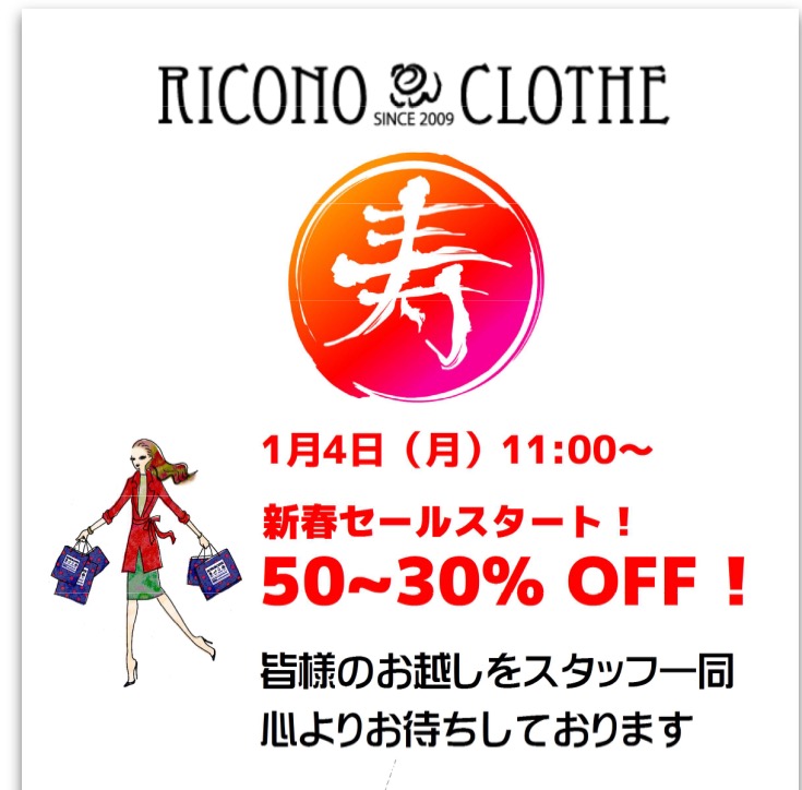 2016 新春セール開催中 あけましておめでとうございます 今年は随分暖かいお正月となりましたね♡ なので、SALE品も、春も着られる薄手のアイテムも沢山揃えてみました。 履きやすいパンプスなども超特価‼️ 日曜日までの特別価格の商品は限定数となっておりますので、お見逃し無くですーっ スタッフ一同、皆様に喜んでいただけるきめ細かいサービスを更に充実致しましてお待ちしております。 何卒宜しくお願い申し上げます 2016年1月6日