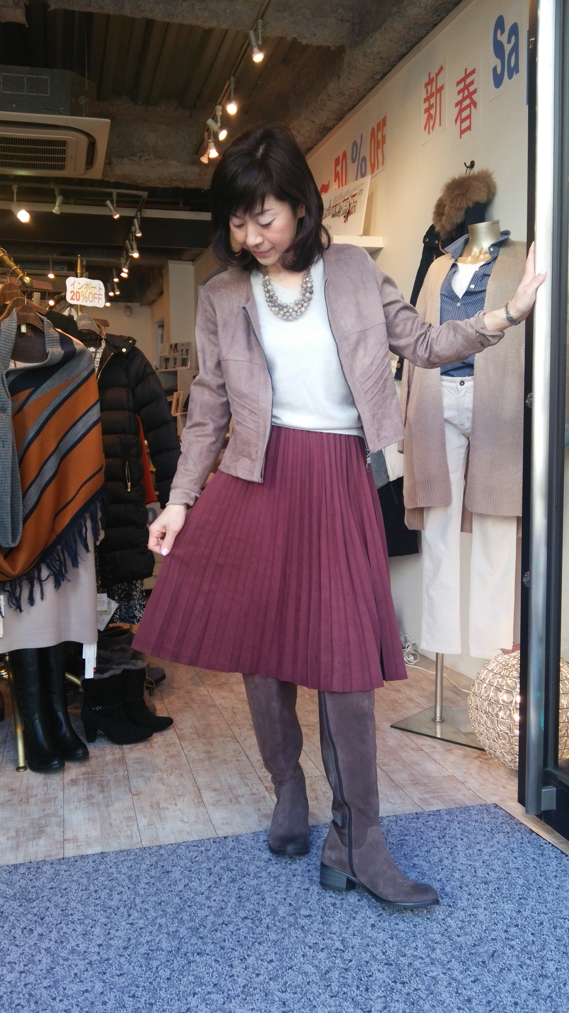 プリーツスカートと合皮のライダースジャケット♪ 丈感もちょうど良いプリーツスカートは春先にも着れる役立ちスカート♪ ブーツとライダースはグレージュで合わせてかっこよく(^^) プリーツスカート40%オフです♪ 2016年1月10日