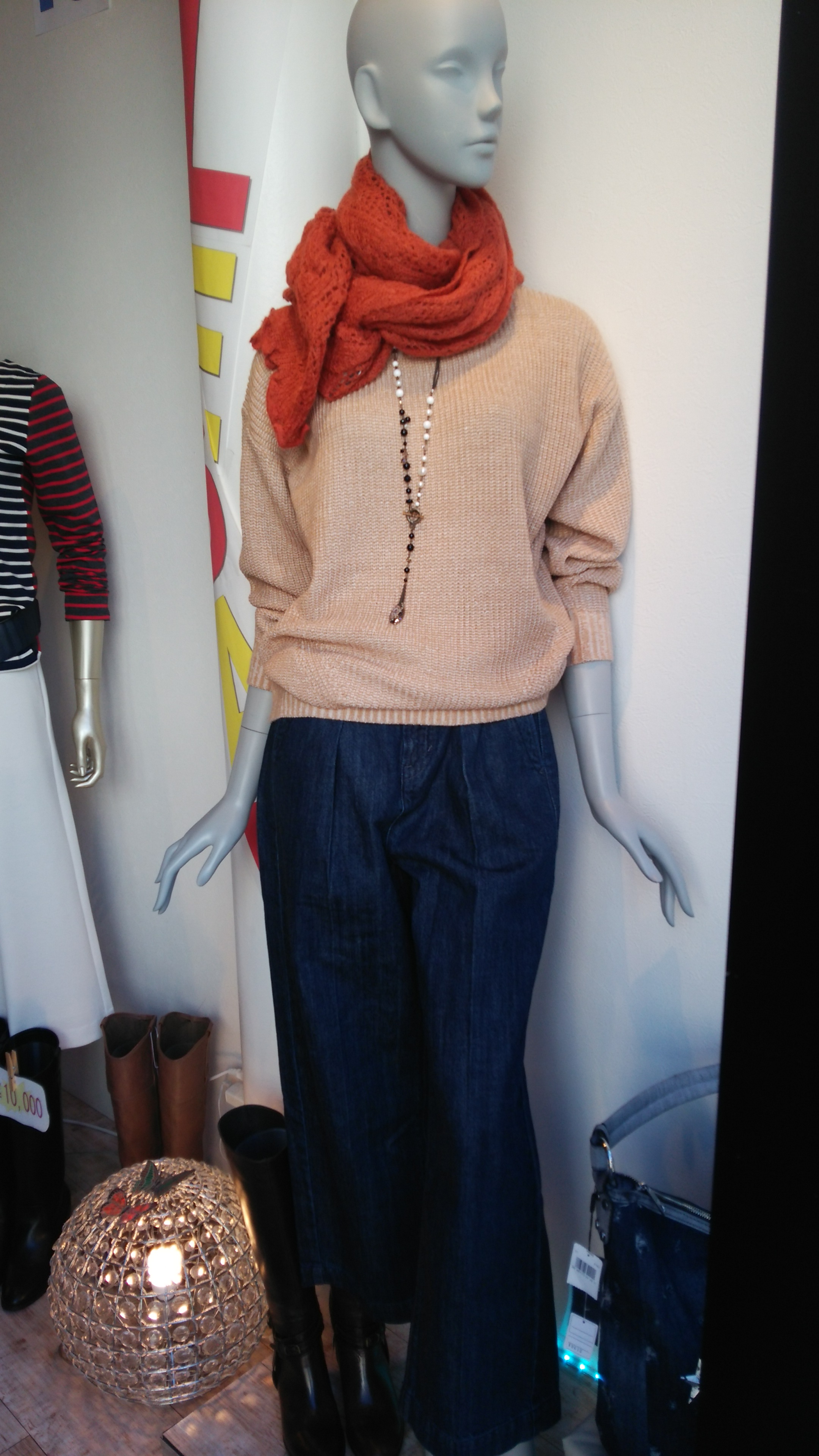 春らしいお色のニットとデニムワイドパンツのコーディネート♪