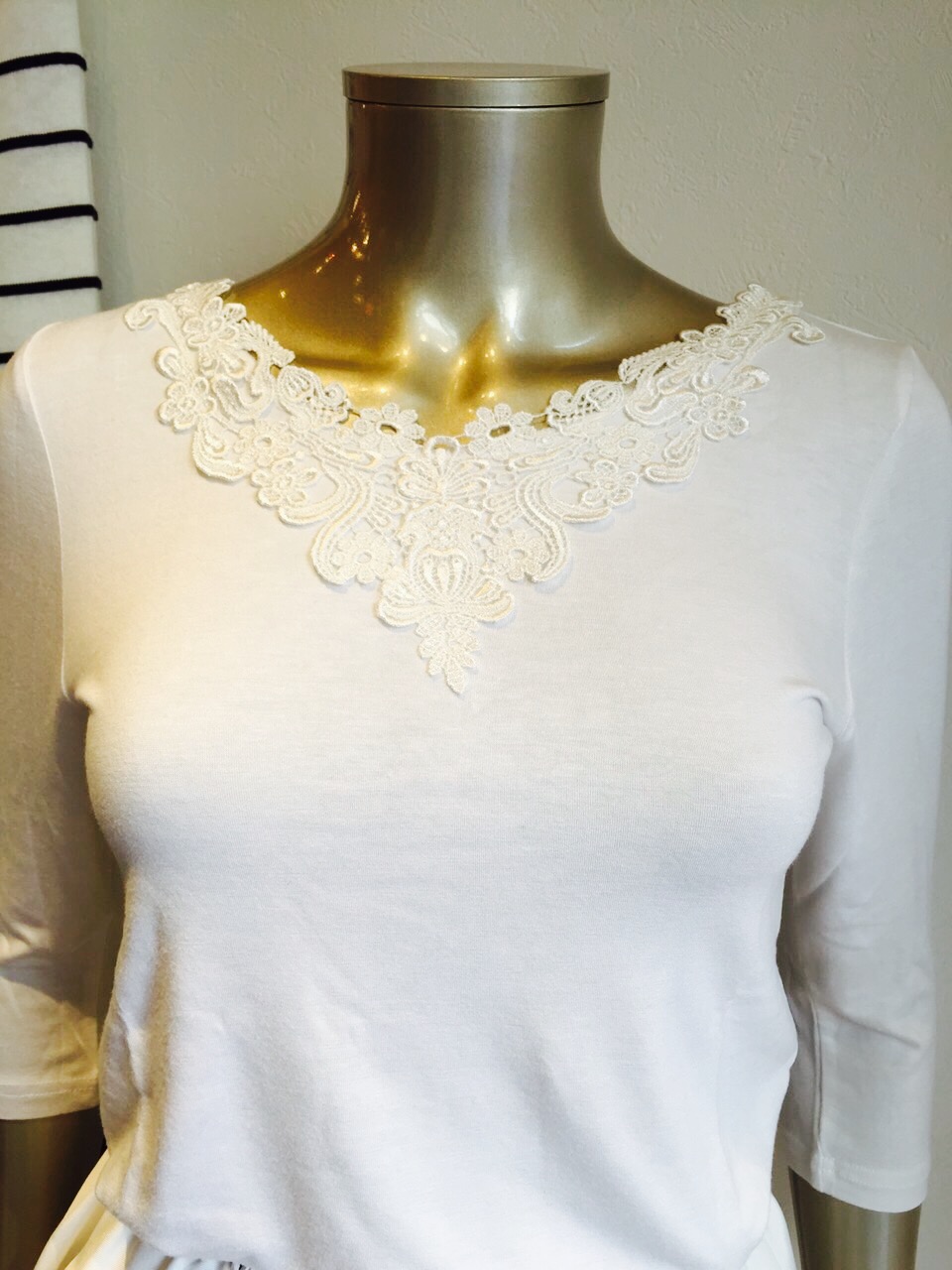 薄手の春のワンピースやシャツの中のインナーとして、初夏には一枚で二の腕が隠せるトップスとして、一年中何たって使える七分袖のカットソー。 おしゃれなワンピースの襟からチラッと見える上質なレースがとってもお洒落で、一度着たらこの万能感、手放せませんよぉ〜
