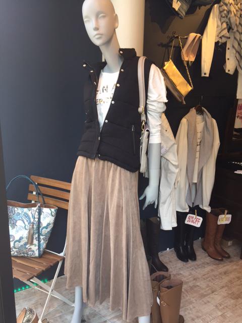 フェイクスエードのフレアスカート グレージュのフェイクスエードスカートは前にスリットが入っていて女らしいシルエットがステキです☆ 春になってもまだ少し肌寒い日のお出かけは 綿素材の中綿ベストがあれば安心ですね♪ スカート ¥12744 ベスト ¥9612 2016年2月4日