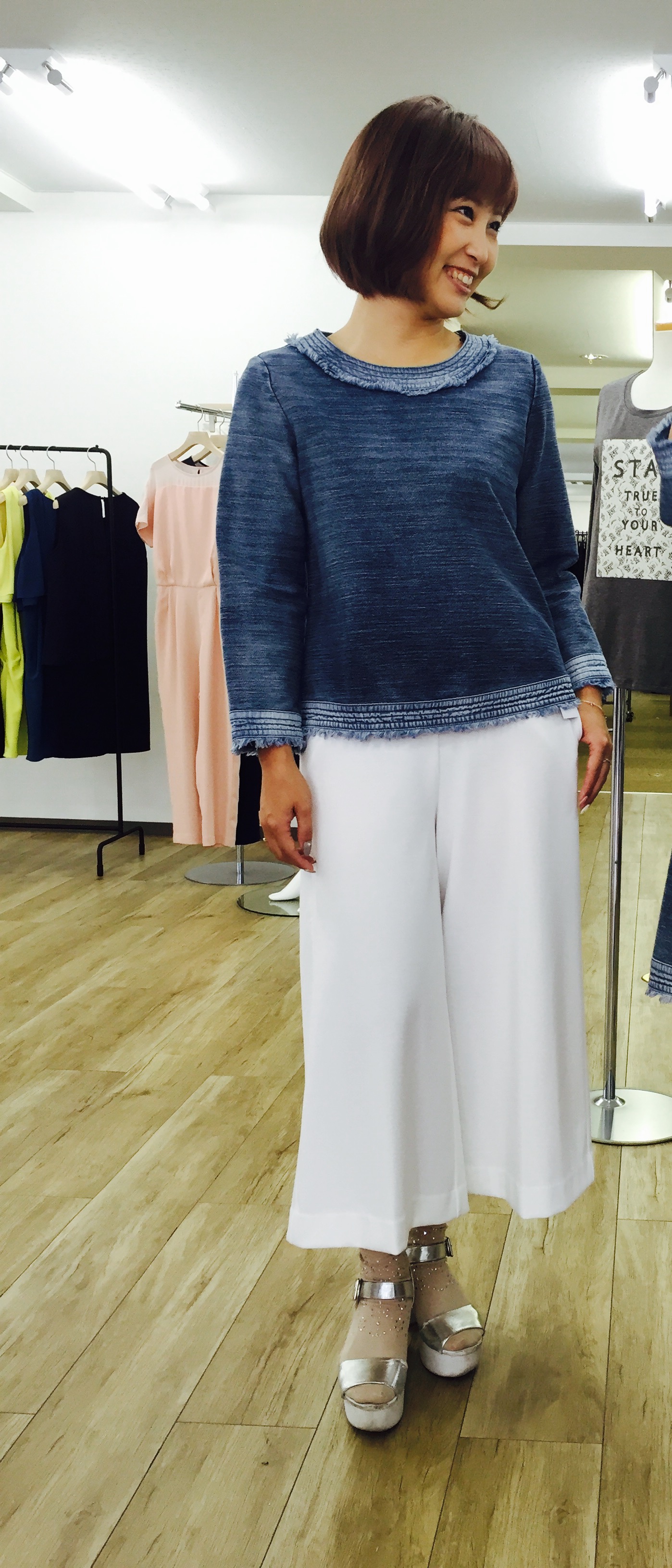 カットデニムのプルオーバーと白ワイドパンツ ストレッチの効いたカットデニムのプルオーバーと、白のワイドパンツで爽やかなコーディネートが入荷しております。 昨年より引き続き人気のホワイトアイテム! ボトムやアウターで取り入れるとおしゃれ上級者に近づきますよぉ〜 おしゃれは気分の問題だから、旬なコーディネートを取り入れて楽しくお出かけして下さいね〜〜 厚底のサンダルもトレンドです 2016年2月6日