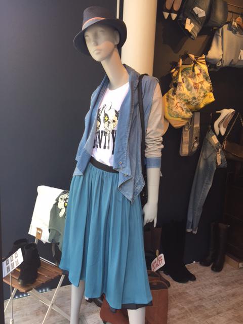 リバーシブルスカート ウェスト部分がゴムなのでどなたにも履きやすいリバーシブルのフレアスカートです。 ブルーグリーンの裏はブラックですので合わせやすさはもちろんのこと、軽くて肌触りも気持ちいいですよ☆ スカート ¥11880 Tシャツ ¥6532 ジャケット¥19224 2016年2月16日