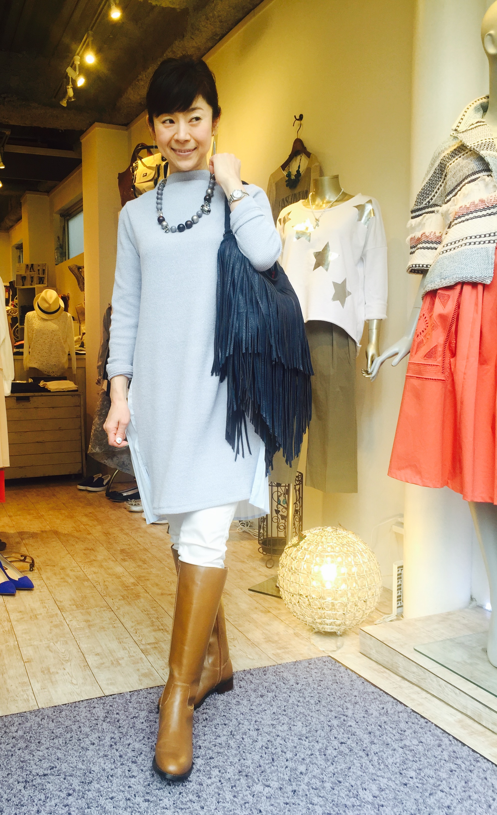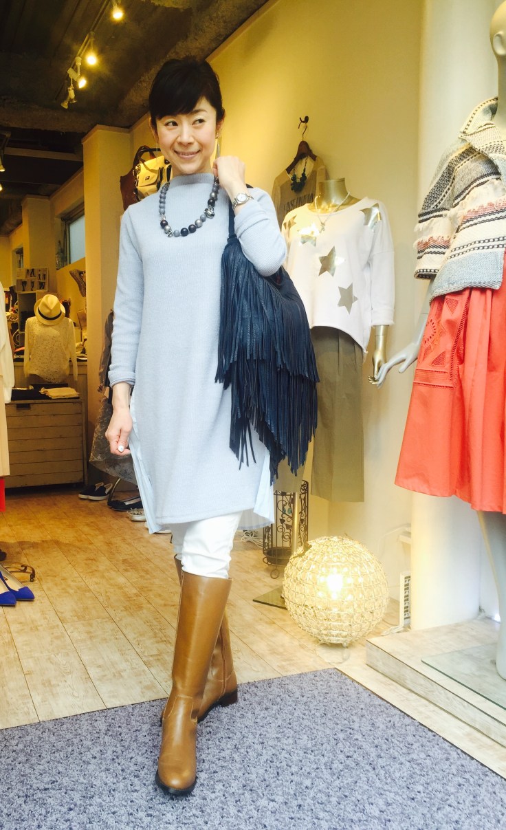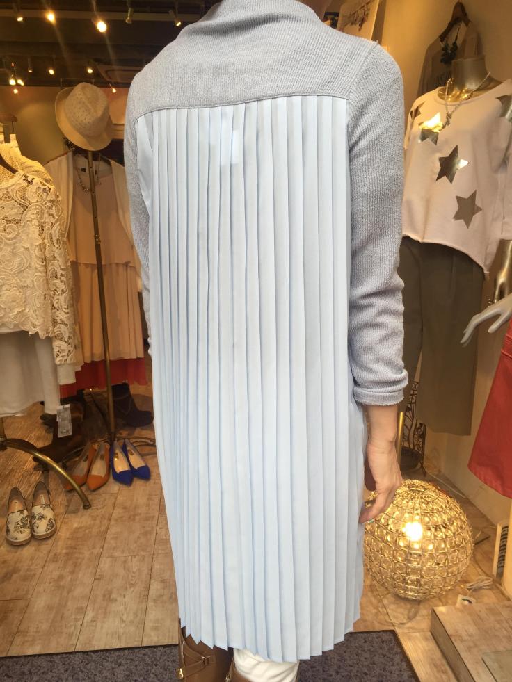バッグプリーツワンピース サックスブルー トレンド感満載のおしゃれなワンピースが入荷して参りましたぁーっ 前はニットで後ろがシフォンのプリーツです 何たって着やすくて、着丈も長めなのが嬉しい、、、 ワンピース 14040円 山崎範子 2016年2月23日