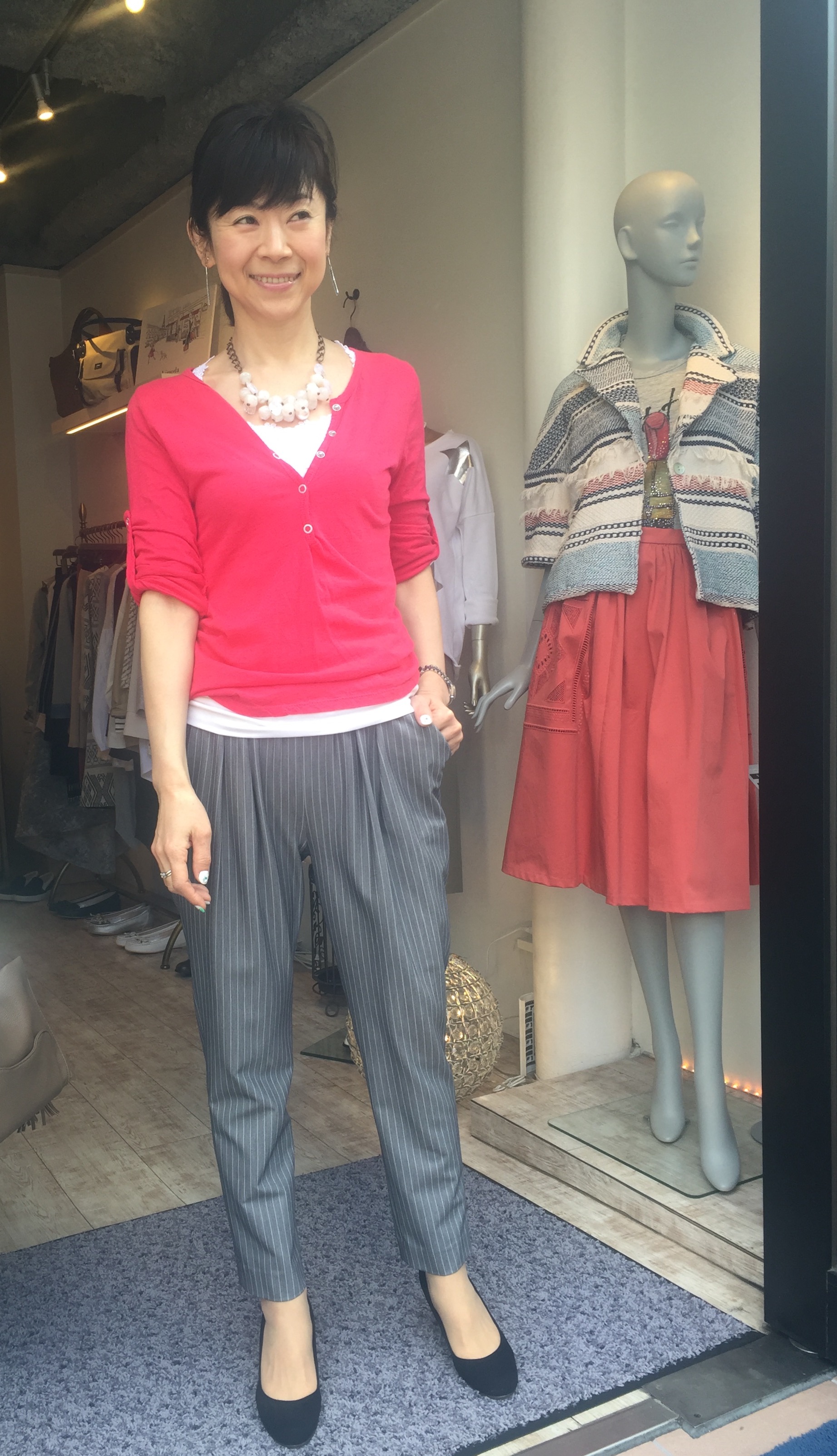 スッキリVネックのインポートカットソー ビビットなカラーから、パウダーピンク、ペールミント、などなどイタリアらしいカラーのおしゃれなカットソーか入荷して参りましたぁー カジュアルでも、スッキリ空いたネックラインで女らしさが漂う、大人カットソーです 長袖ですが、袖を捲り上げて着れるので、初夏もバッチリ! 気になる二の腕も、チョースッキリ見えますよぉ〜 ストライプのテーパードパンツもお薦めです 2点で10%オフのこの時期をお見逃しなくーっ 山崎範子 2016年2月25日