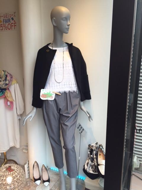 爽やか通勤スタイル ストライプのテーパードパンツにレースが施されてるトップスを合わせると クールなパンツスタイルも女らしい優しい雰囲気になりますね。 Aラインシルエットの丸首ジャケットを羽織るときちんと感もしっかり出るので通勤にもOKですね☆ パンツ ¥16200 カットソー¥5292 ジャケット ¥20520 2016年3月10日