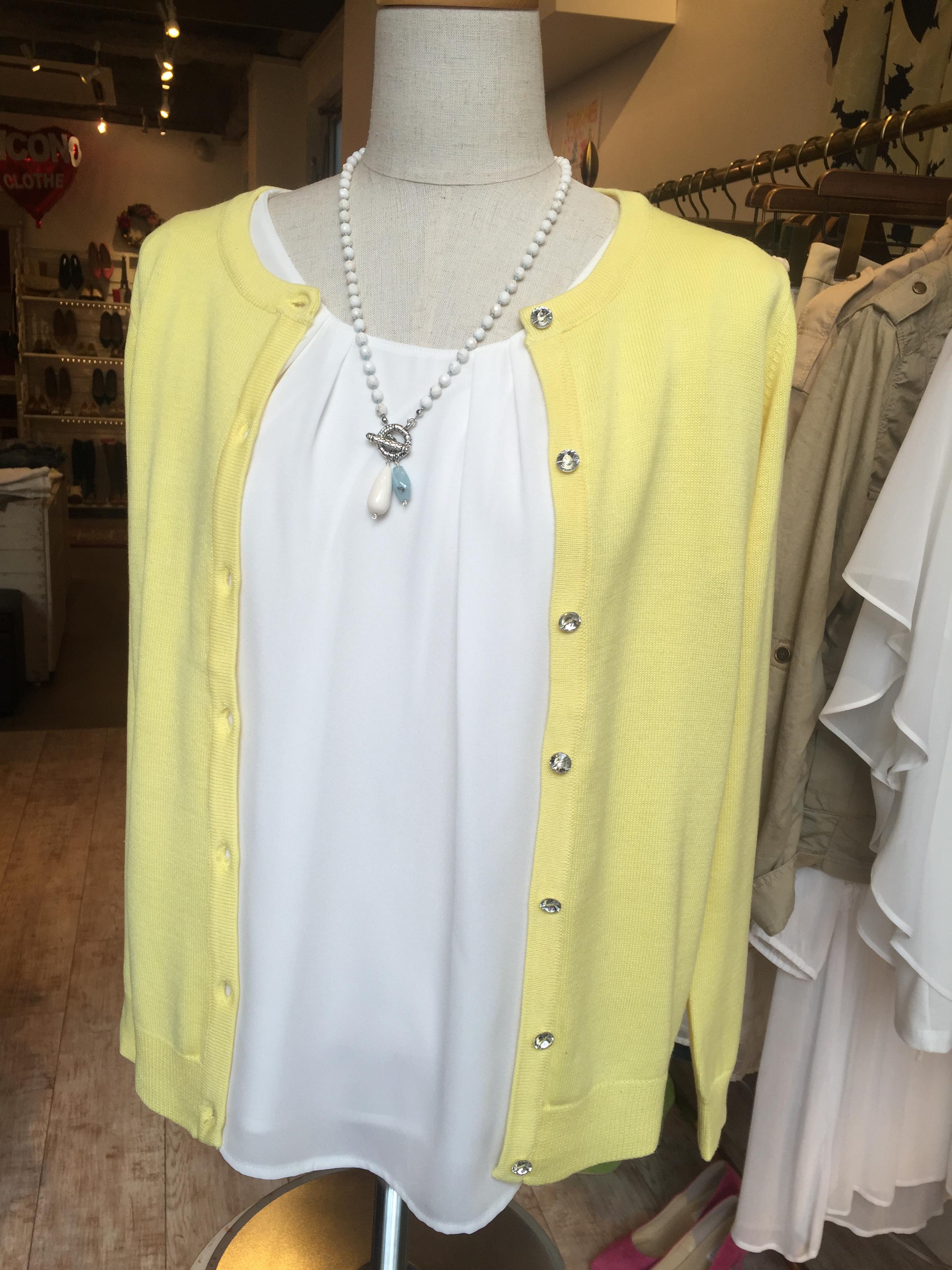 ブラウス、カーディガン、半袖ニットの3点セット 12800円‼️ こちらは、半袖のシフォンブラウスと ビジュー付きの半袖ニット、更に、お写真のカーディガンが付いた、何と3点セットのアイテムです‼️ こんなに使えるアイテムが揃ってーっ、12800円の特別プライスです お色は、レモンイエロー、ミントグリーン、ネイビーの3カラーです 神戸老舗ニットメーカーの自信の一品ですよぉ〜 山崎範子 2016年4月8日