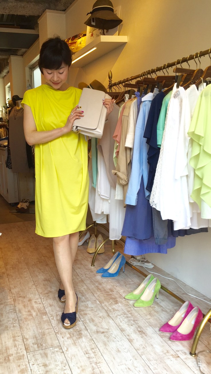 サフランイエローのワンピース 一枚でストンと着られる、カットソー素材のワンピースです 気になる膝や、腕が細く見えるお袖のデザインが嬉しい一枚です 他にカーキ色もございます ワンピース 17280円 バック 9612円 サンダル 12960円 2016年4月12日