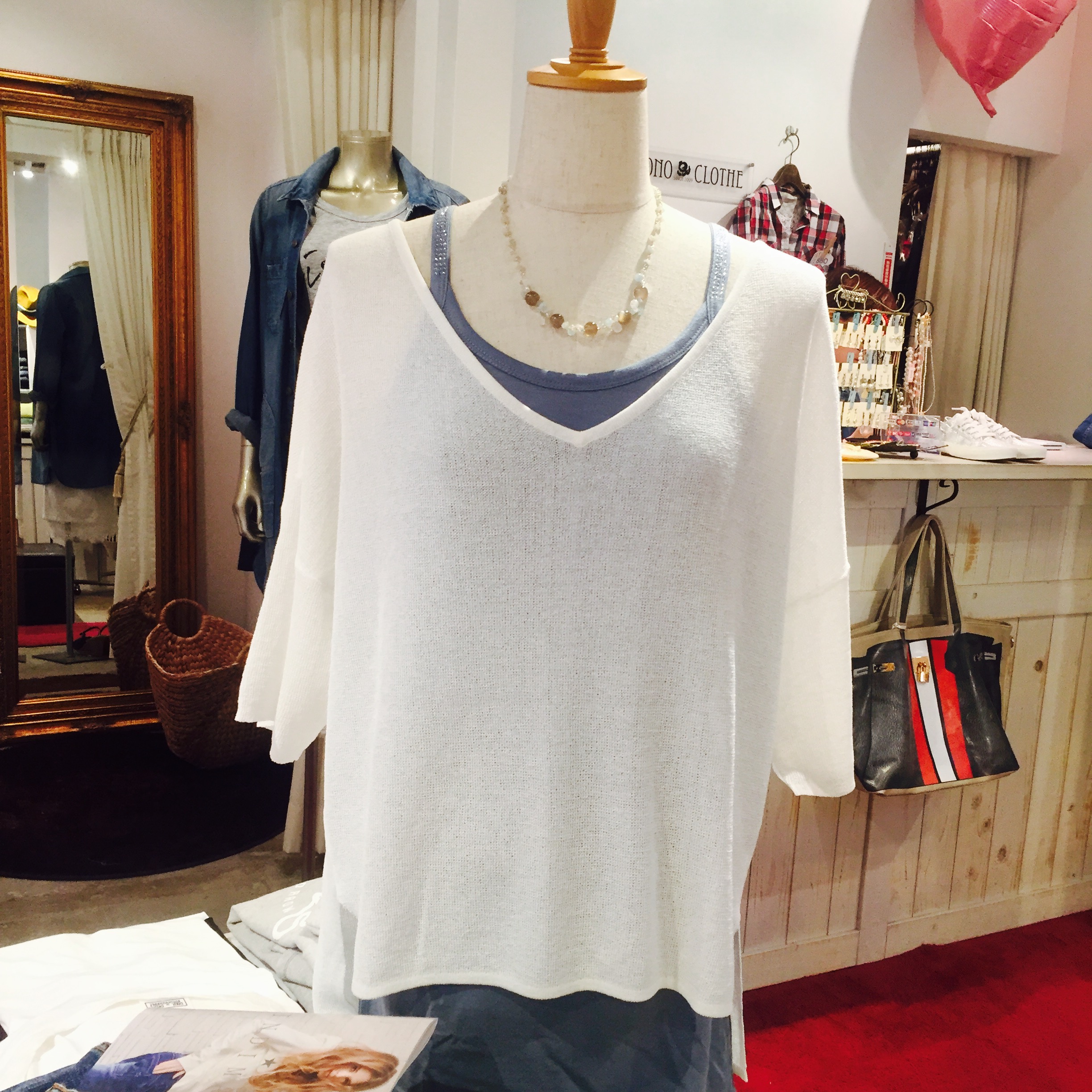 着痩せVネックニット 5900円 レーヨン、ナイロンの混紡の着痩せVネックニット♡ ヒップが隠れる着丈も魅力的 カラーは、オフ白、黒、ベージュの3カラーです インナーのキラキラキャミソールもお薦めですよぉ〜 キラキラキャミソール 3900円 2016年4月18日