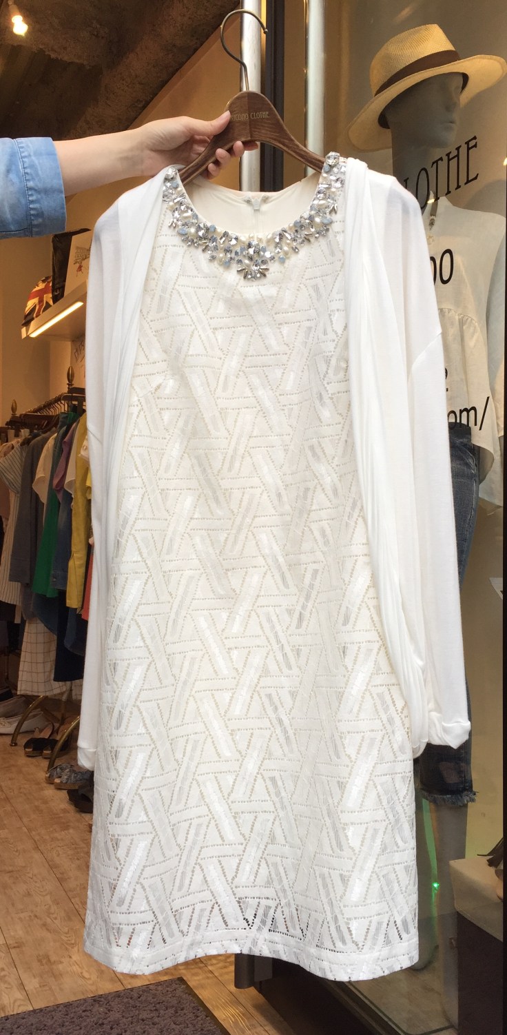 ビジュー付きデザインワンピース 幾何学の織り生地に、手付けビジューのワンピースが入荷しております。 膝丈になる着丈も嬉しい、、、 ジャケットを羽織って、お仕事にもお役立ち♡ お色違いでブラックもございます 2016年5月4日