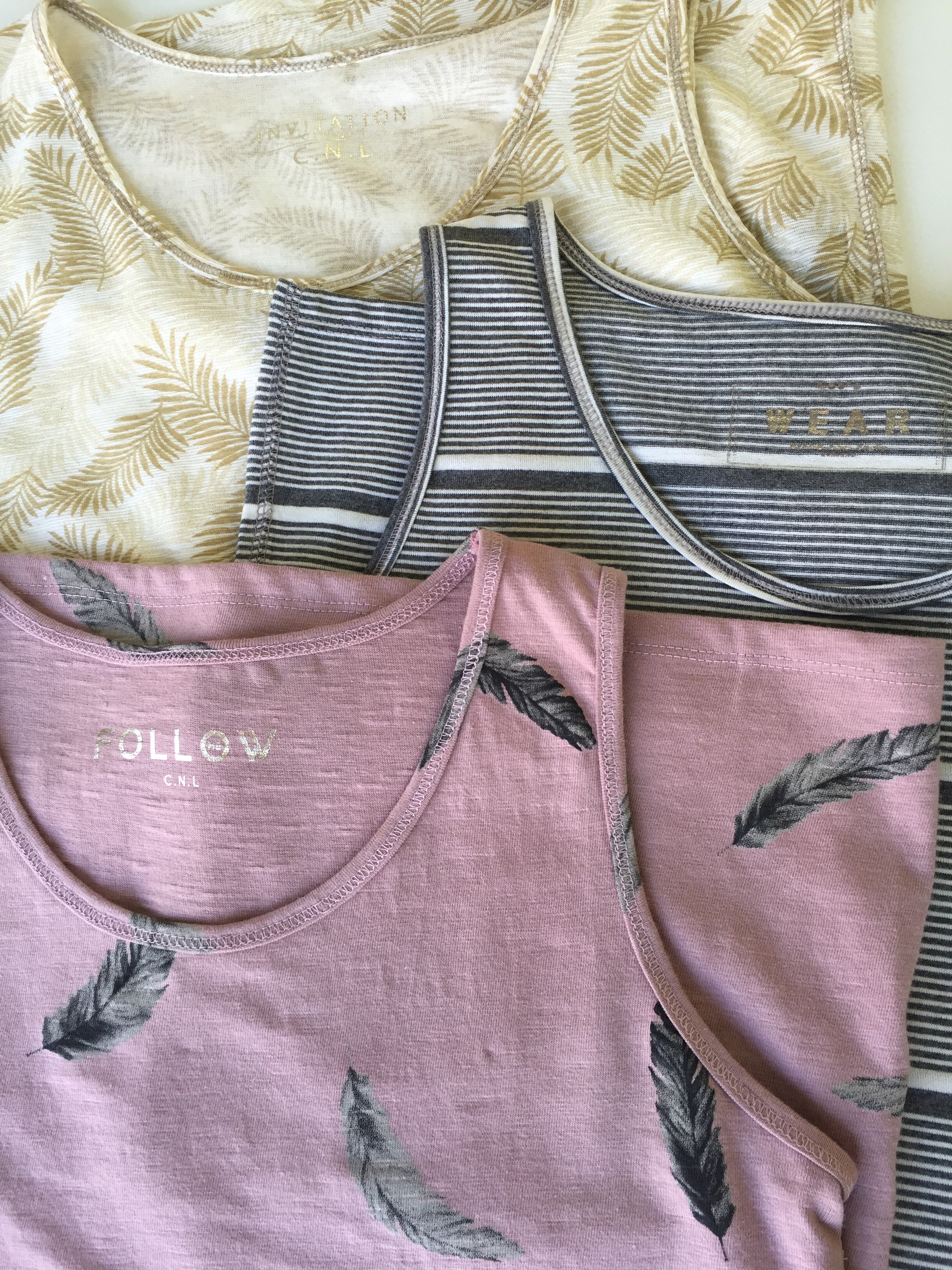 プリントタンクトップ 4900円 めっちゃおしゃれなプリントのタンクトップです シャツやニットの中に、チョイと効かせるのがニクいーっ💓 リーフプリントや、マルチボーダーなど、、、 どれも気になる〜 タンクトップ 4900円 2016年5月19日