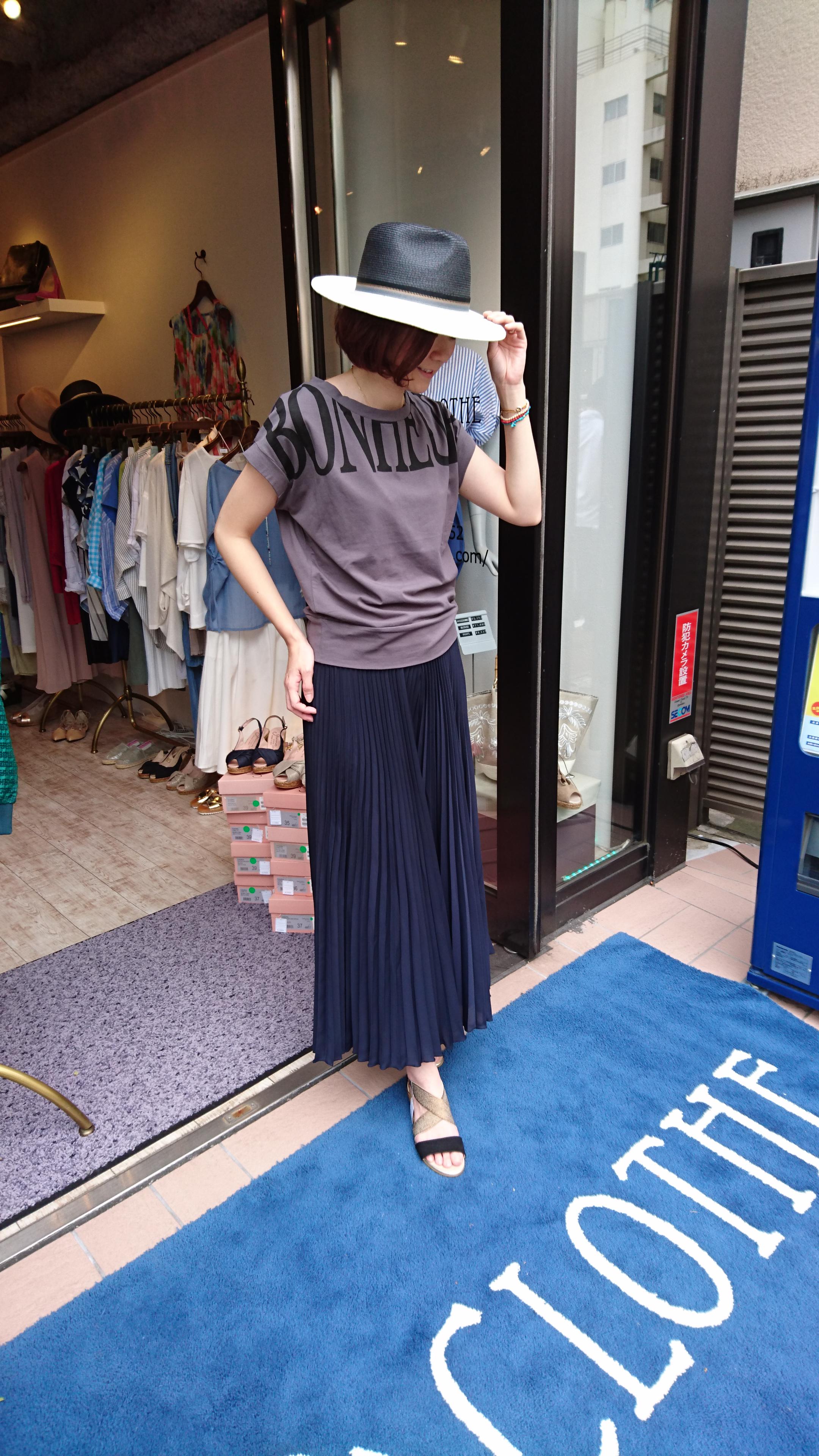 プリーツワイドパンツとロゴT さらさらしていて履き心地の良いプリーツワイドパンツ♪絶妙なプリーツ感でヒップがスッキリ見えます(^o^) Tシャツ 6372円 プリーツワイドパンツ 10584円 2016年6月19日