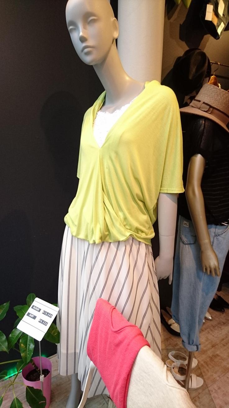 チュールスカートと変形カットソー♪ ストライプのチュールが新鮮なスカートとカーディガン風に見えるカットソー♪ カットソーは、アップルグリーンとホワイトの2色です カットソー 10584円 スカート 8532円 2016年6月6日