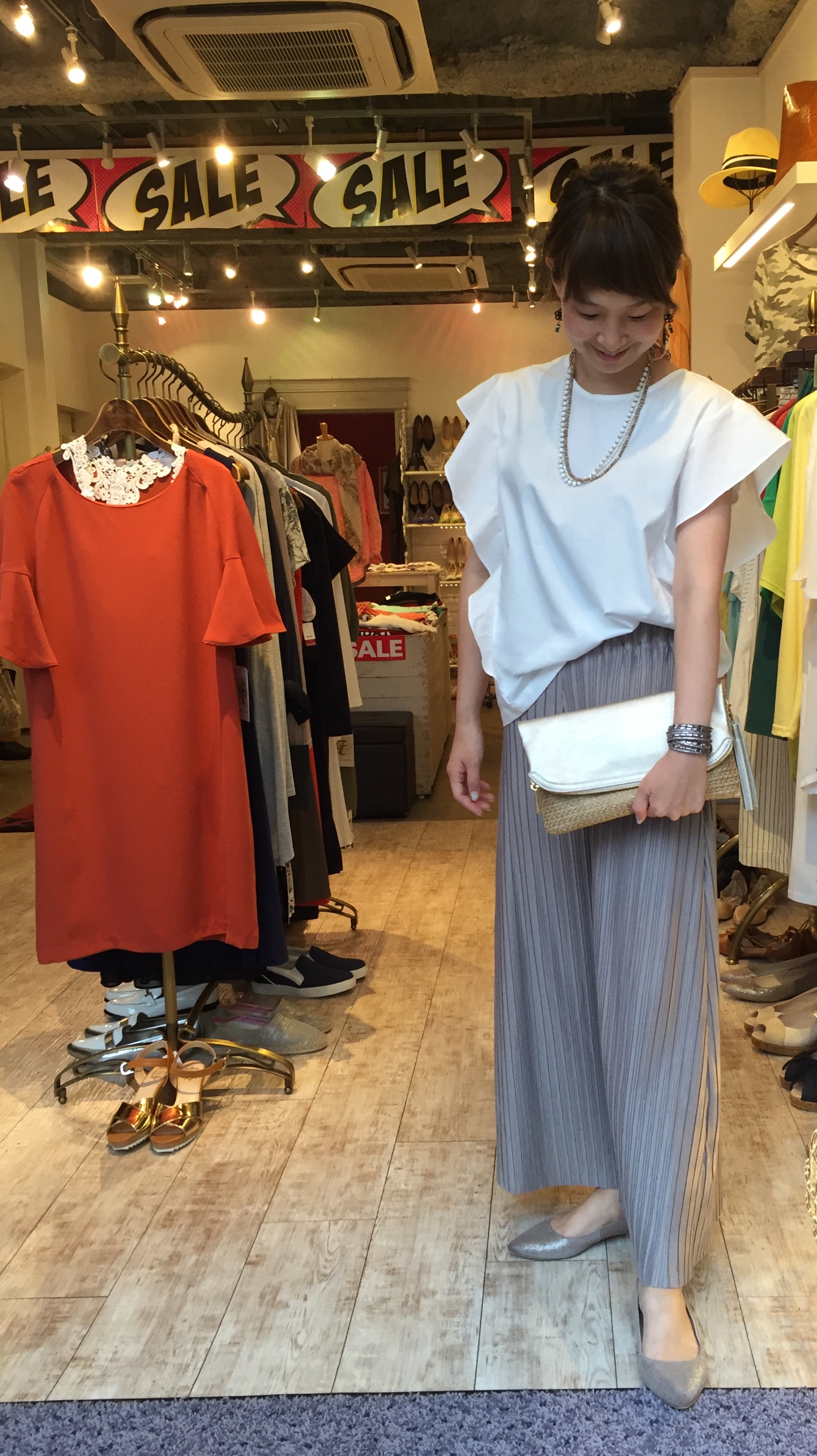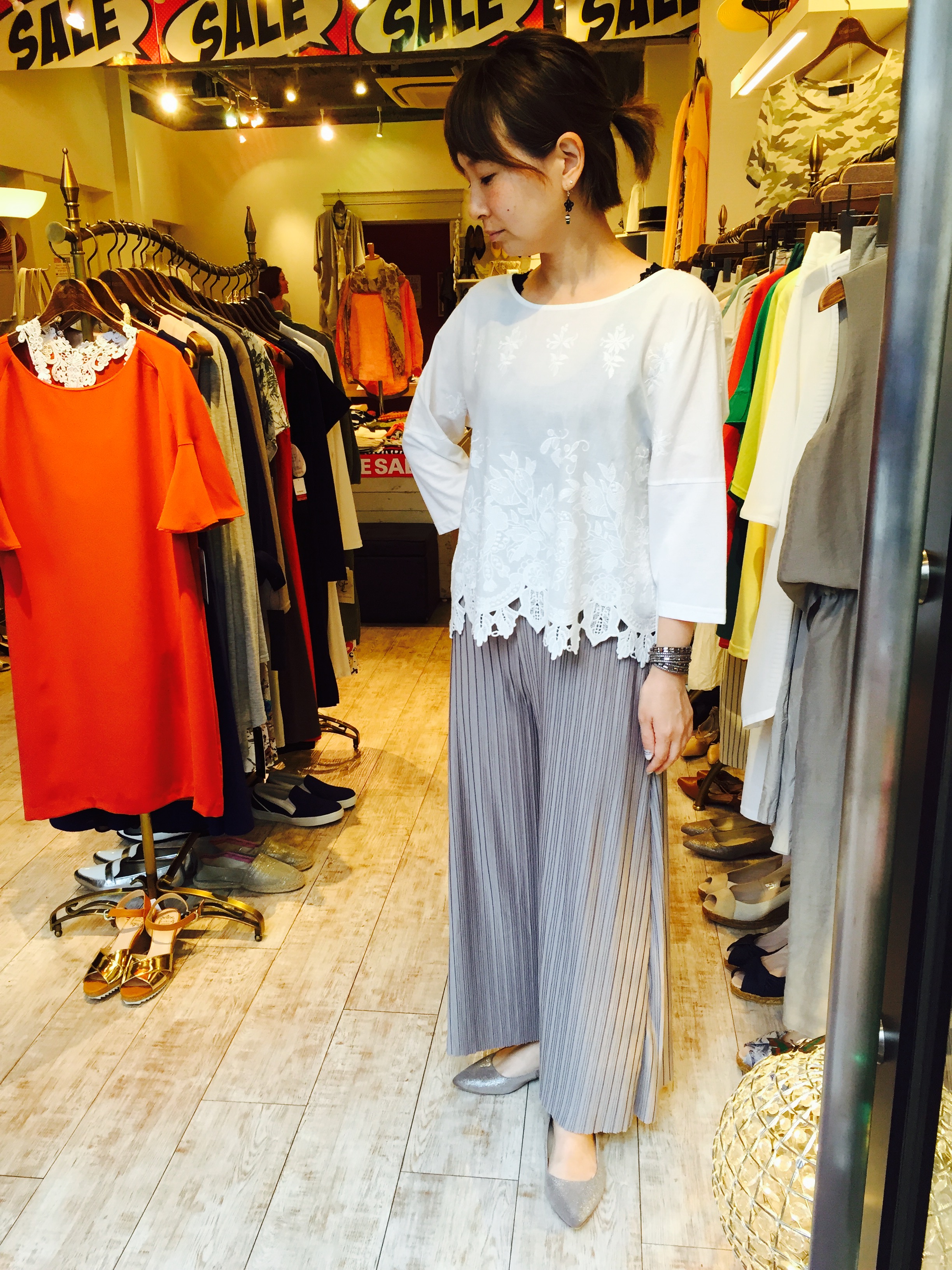 レースの袖ありブラウス 7409円 裾のバティックレースが素敵な コットン素材の7分袖ブラウスです サラッサラ〜のワイドパンツも、とってもお買い得ですよぉ〜 お色違いで黒もございます ブラウス SALE 7409円 パンツ SALE 6709円 メタリックシューズ 10584円 2016年7月10日