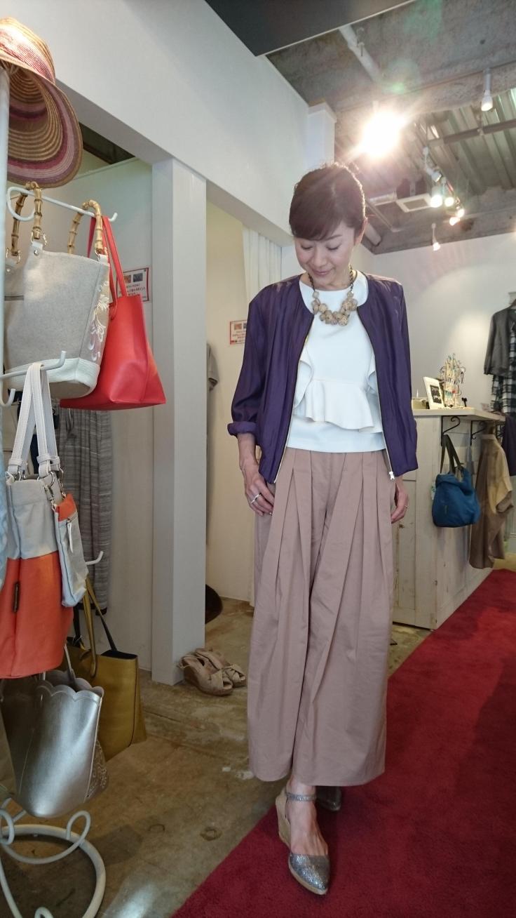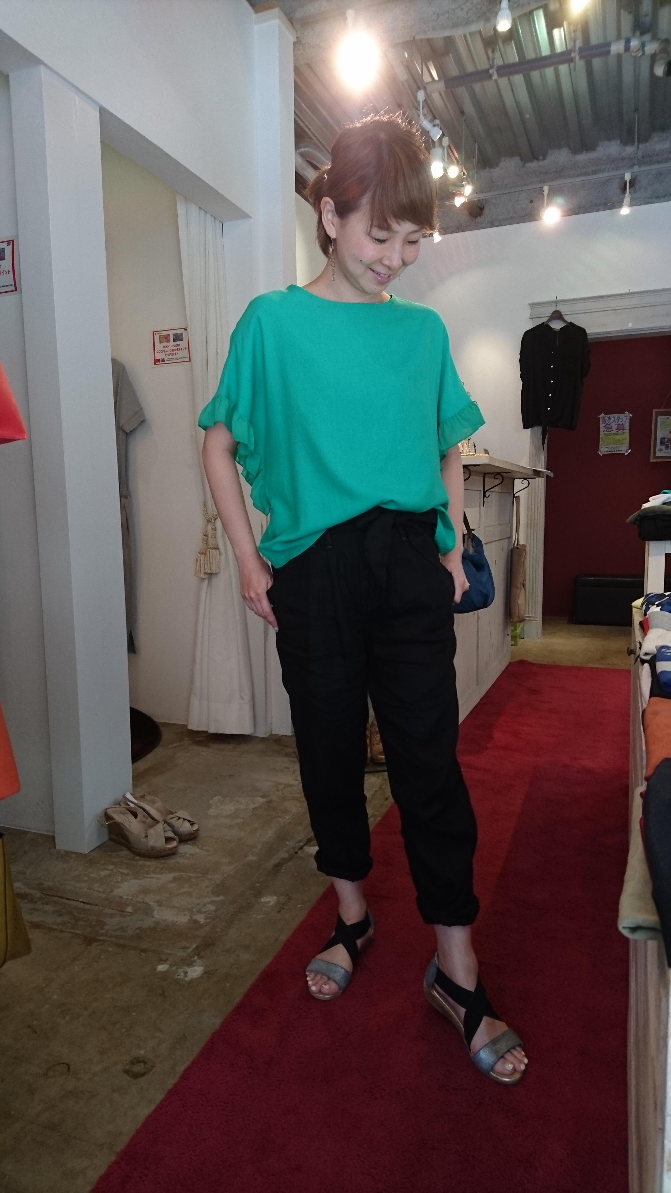 フリル袖ブラウスと麻パン♪ きれいなグリーンのブラウスはレーヨンとポリエステルなのでシワにもなりにくい♪ ブラックの麻パンも涼しいですよ~(^-^) ブラウス 5972円 パンツ 5216円 2016年8月1日