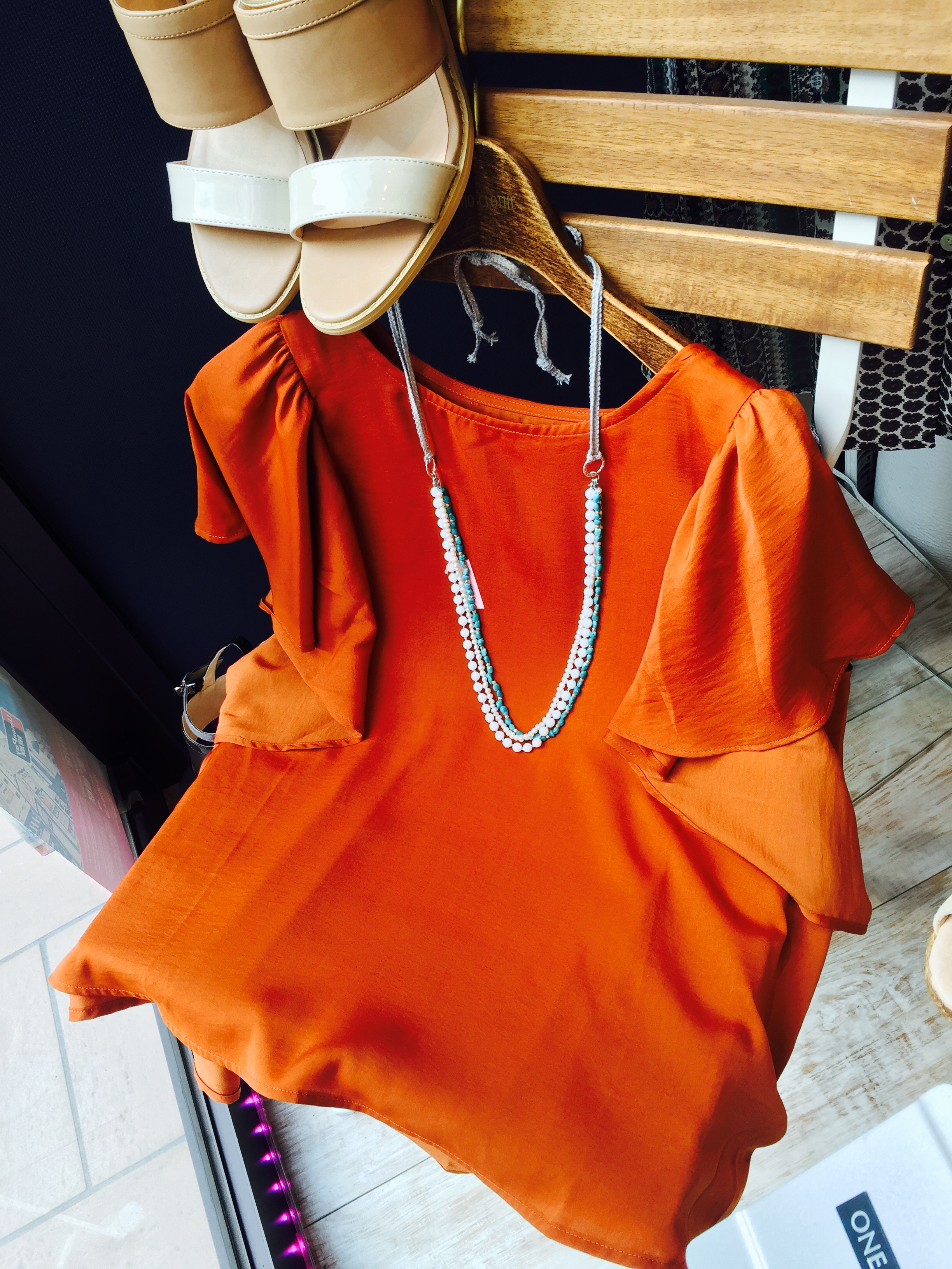 テラコッタカラーのフリルブラウス 5216円💓 二の腕カバーに最適な袖フリルブラウスに、新色の秋色が入荷しました。 8月の残暑に、一足お先に秋を先取り‼️ メーカー協賛で、驚きのプチプラです。 今回限定数入荷しました。 お洗濯もノーアイロンで楽チンなんだなぁ、、、 袖フリルブラウス 5216円 カーキ、ベージュ、ネイビーなどございます 2016年8月4日