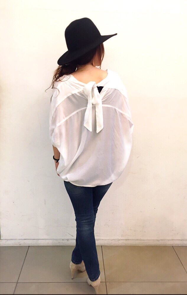 バックリボンブラウス 秋の新作ブラウスは、女心をくすぐるバックリボンのデザインです 艶っぽいとろみのある生地で、綺麗なシルエットを実現♡ バックリボンブラウス 12744円 オフ白、ベージュ、ブラックの3カラーです 2016年8月11日