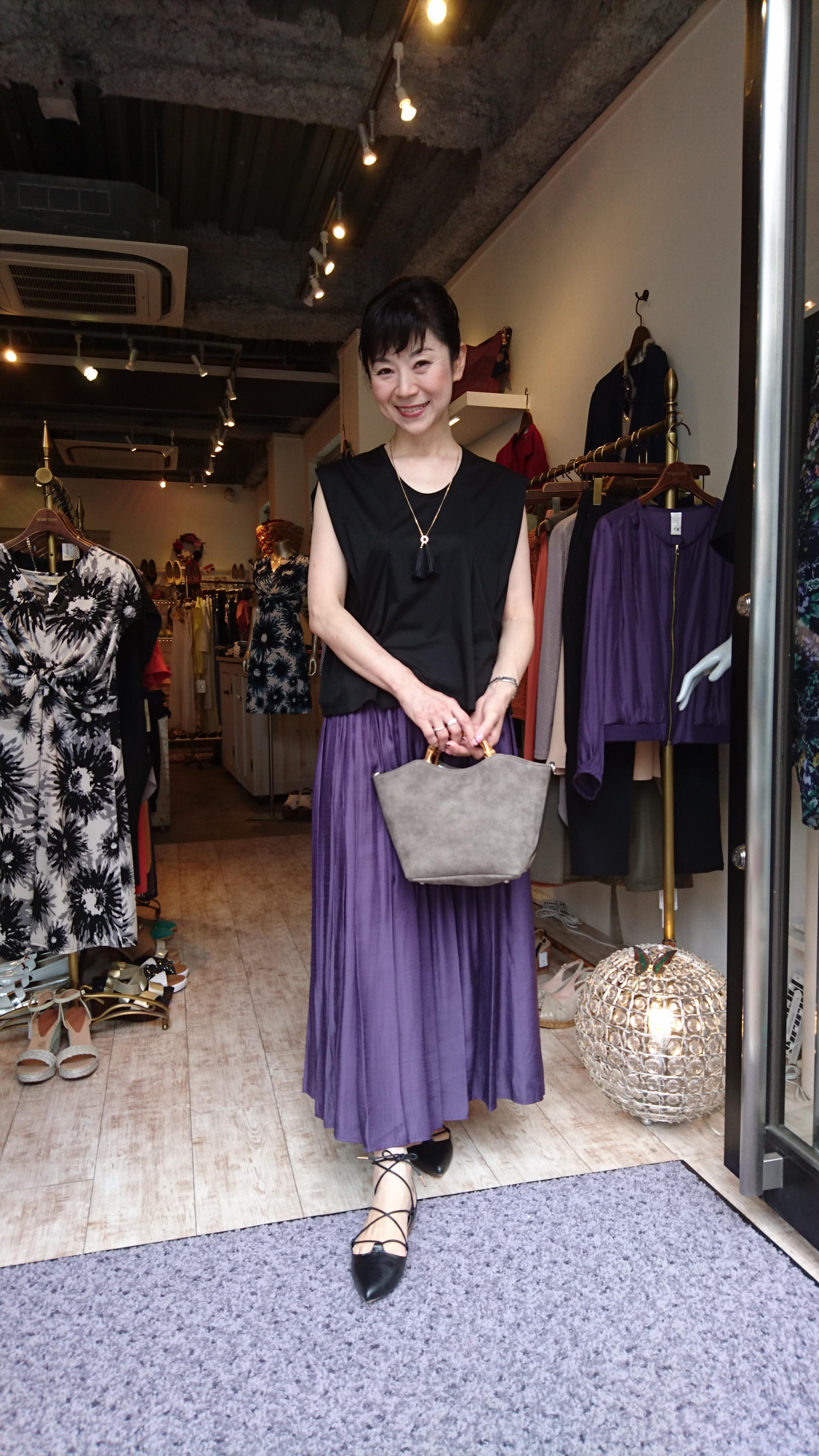 デザインカットソーとシャイニースカート♪ 光沢のある紫のロングスカートとブラックのデザインカットソー♪ 秋を意識した涼しいコーディネートの完成です(^-^) デザインカットソー 10584円 スカート 9612円 2016年8月15日